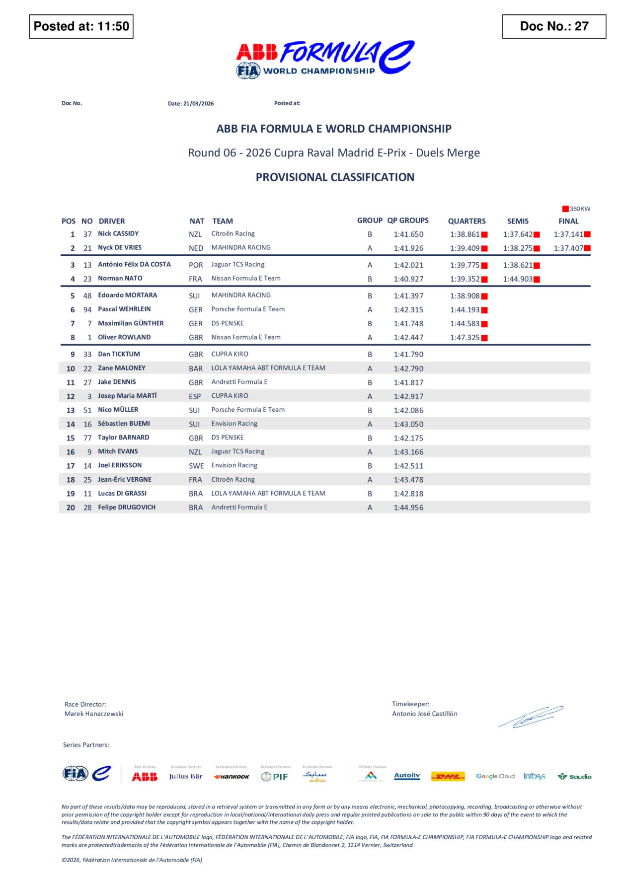 Dan Ticktum apre il gruppo dei piloti esclusi al termine della fase a gruppi, con l’inglese che oggi scatterà nono davanti a Zane Maloney e Jake Dennis, fresco di rinnovo contrattuale con Andretti Global e solamente 11° al termine di queste qualifiche. L’ex campione del mondo scatterà davanti al pilota di casa José Maria Martì, 12° al termine delle qualifiche odierne. Più indietro altri piloti sin qui protagonisti del campionato come Taylor Barnard e Mitch Evans, solamente in 15° e 16° posizione al termine delle qualifiche. Solamente ultimo Felipe Drugovich, autore del miglior tempo nelle FP2 ad inizio giornata.
