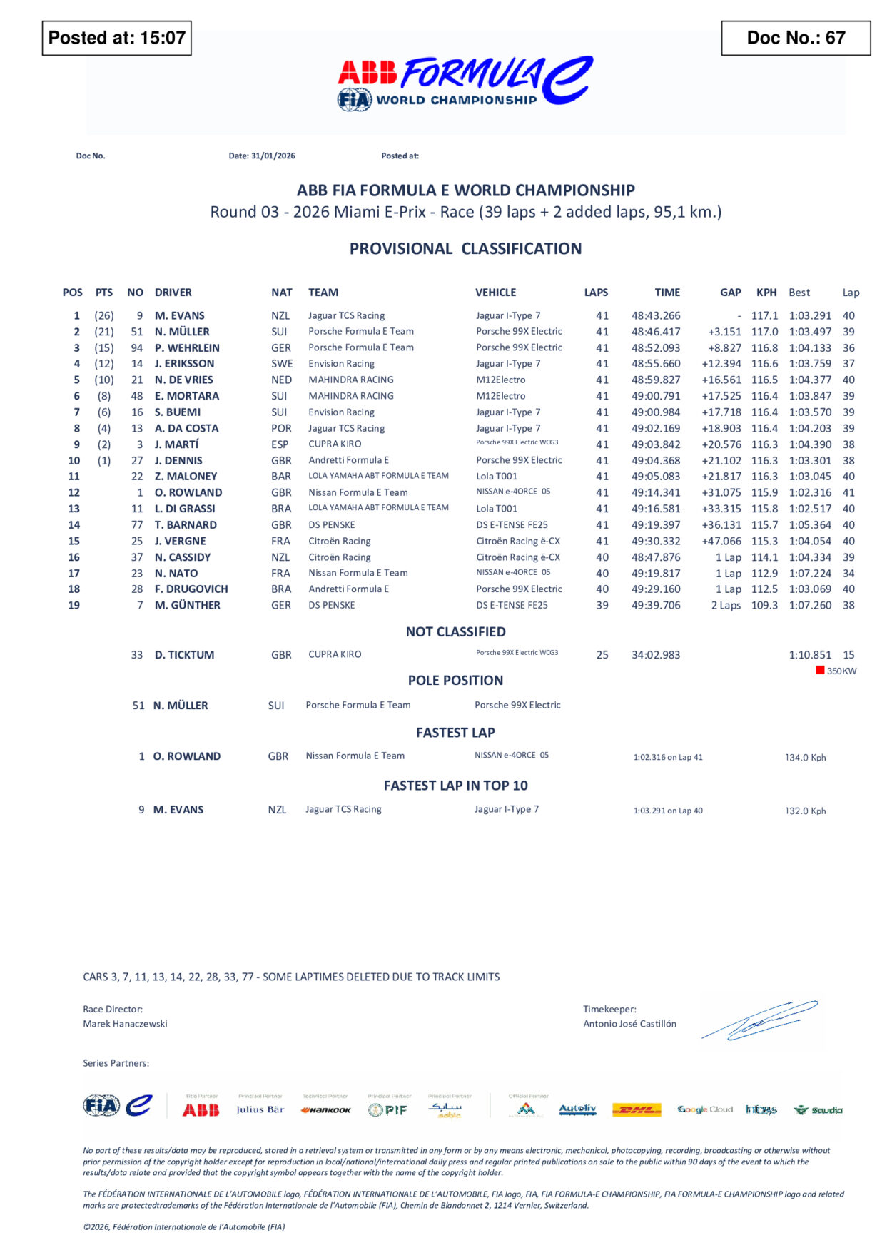 Nonostante questo 0 accumulato, Cassidy mantiene il comando della classifica iridata con 40 punti, ma alle sue spalle irrompe Wehrlein che grazie a questo podio è ora secondo in campionato a 38 punti, a -2 dal portacolori Citroen. Ampiamente della partita anche Dennis, terzo a quota 37, Rowland, quarto e fermo a 34, ed anche Müller, che dopo questo ottimo weekend è ora quinto in campionato con 33 punti, a sole sette lunghezze dalla vetta.