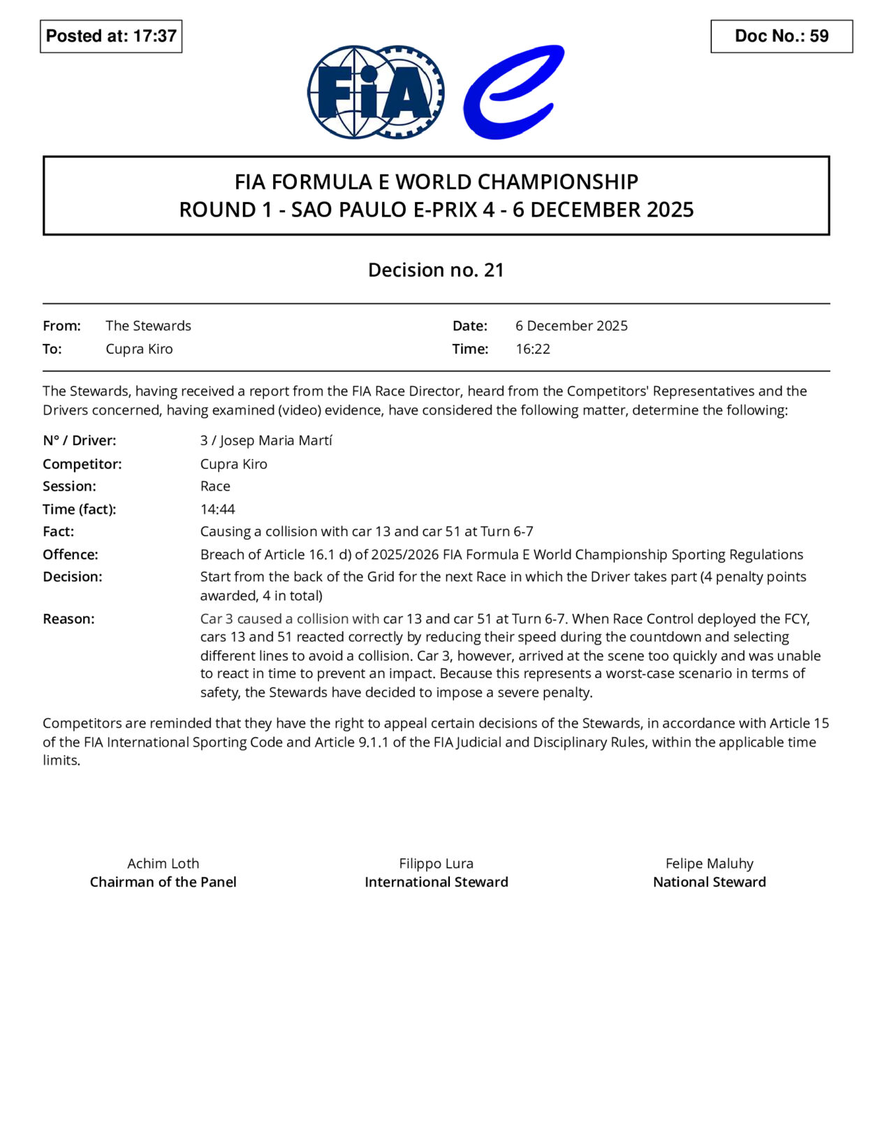 L’episodio è stato rivisto al termine della gara, con la Direzione Gara che ha ritenuto lo spagnolo come unico responsabile per l’impatto non avendo rallentato a sufficienza durante il countdown che precede l’inizio del periodo di FCY che viene comunicato via radio dal Direttore di corsa a tutti i piloti, cosa che Müller e Da Costa hanno fatto prendendo due linee differenti per evitare incidenti tra loro. Per questo motivo la Direzione Gara ha usato il pugno duro, penalizzando Martì relegandolo in fondo alla griglia di partenza nella prossima gara a cui prenderà parte, aggiungendogli anche quattro punti sulla propria licenza, motivando la decisione con il fatto che questa situazione “ha rappresentato il peggior scenario possibile in termini di sicurezza”.