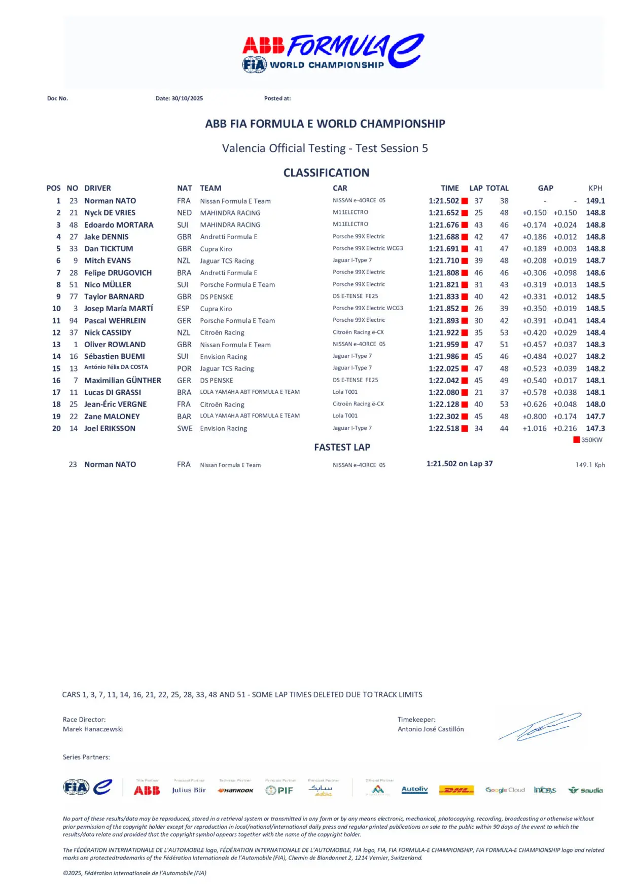 Settimo tempo per Pascal Wehrlein davanti a Dan Ticktum, con Sébastien Buemi e Nick Cassidy a completare la Top10 in nona e decima posizione a meno di due decimi di ritardo, seguiti da un ancor positivo José Maria Martì in 11° posizione.