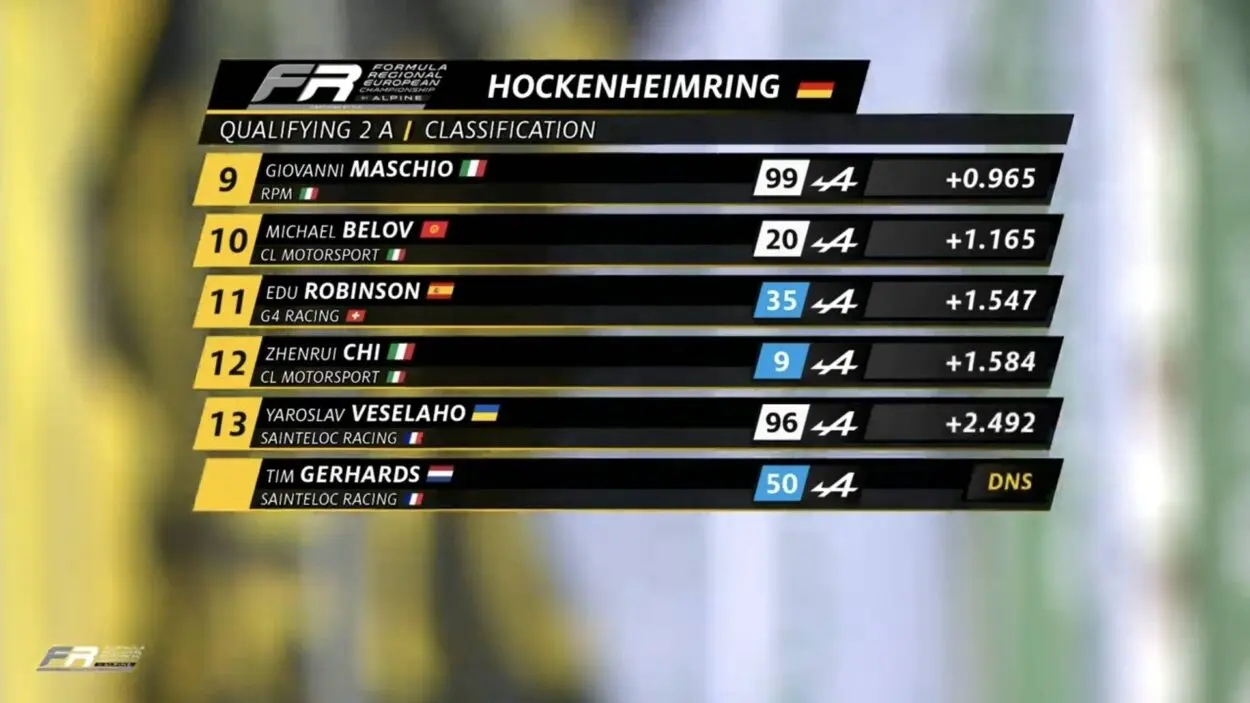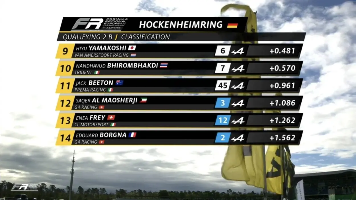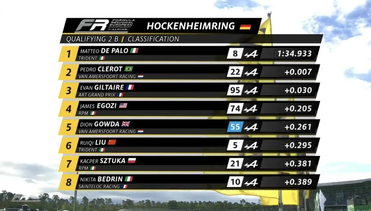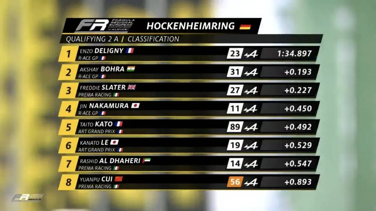 Nel più veloce dei due gruppi della Qualifica 2, Enzo Deligny firma anche la seconda pole position del weekend tedesco con un super giro in 1.34.897, irraggiungibile per tutti: il pilota franco-cinese fa ancora una volta la differenza sul tecnico Hockenheimring, battendo il compagno di squadra Akshay Bohra di 193 millesimi e il contendente al titolo Freddie Slater, quest’ultimo a oltre due decimi dal tempo pole. Quarta posizione per Jin Nakamura (+0.450), mentre chiude la Top 5 del gruppo Taito Kato (+0.492).