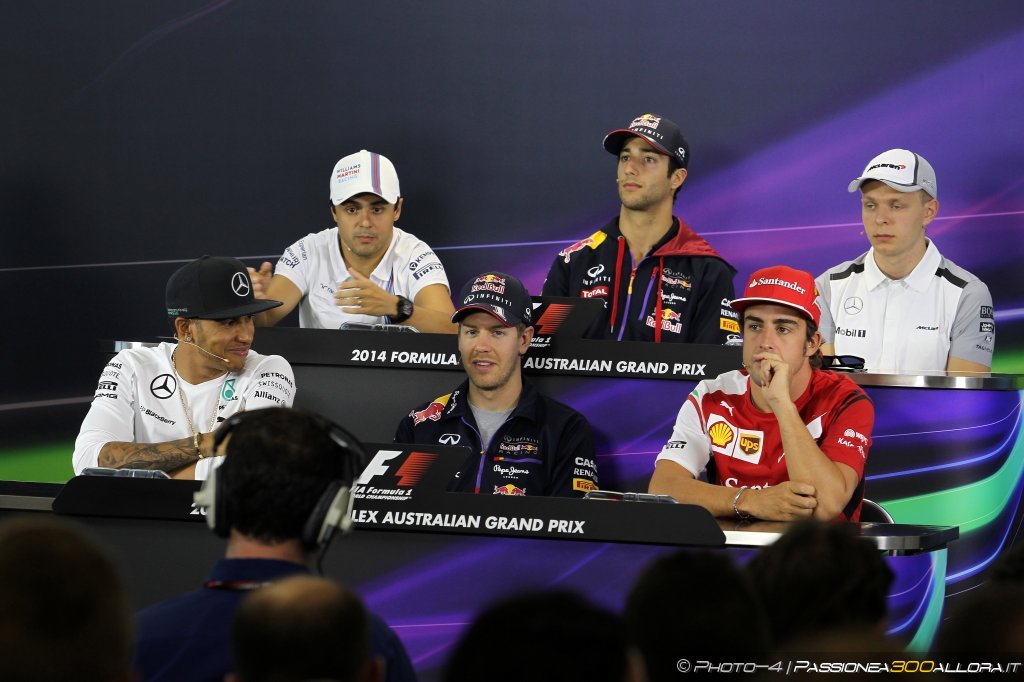 Il weekend del Gran Premio d’Australia è sempre più vicino e uno dei rituali del giovedì, è la conferenza stampa dei piloti. Erano presenti: Felipe Massa (Williams), Daniel Ricciardo (Red Bull Racing), Kevin Magnussen (McLaren), Lewis Hamilton (Mercedes), Sebastian Vettel (Red Bull Racing), Fernando Alonso (Ferrari). Ve ne riportiamo i punti salienti e a nostro avviso più interessanti.