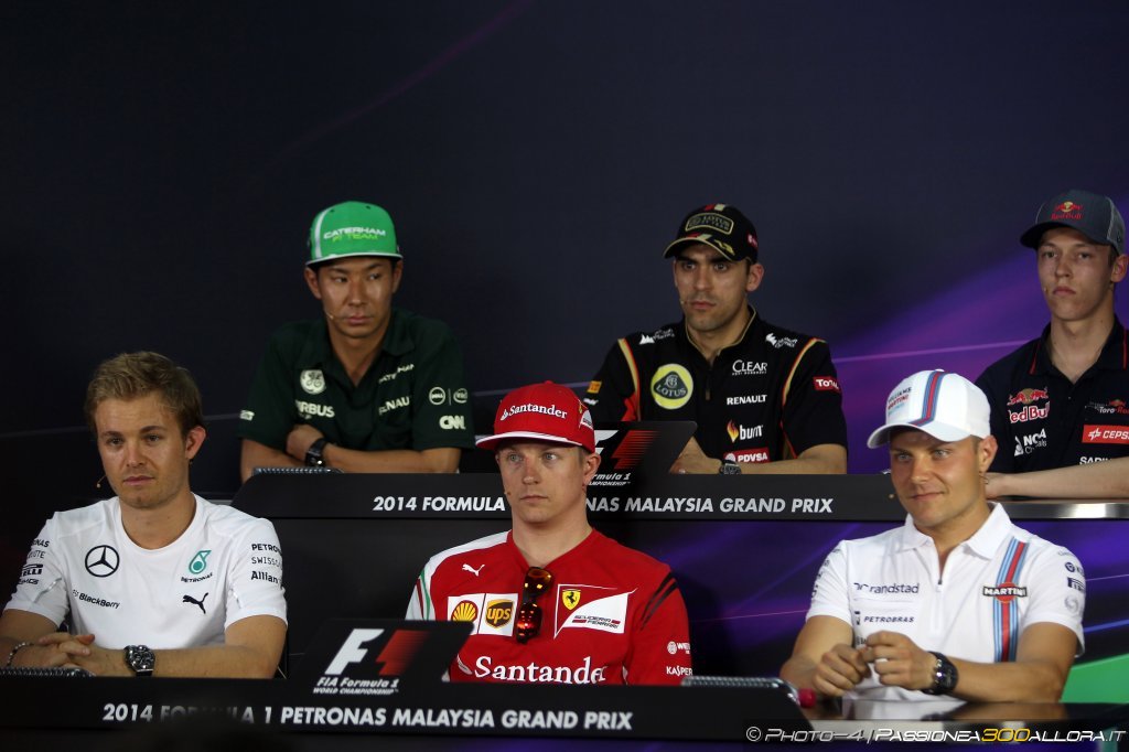 Qui di seguito, potete trovare le dichiarazioni più interessanti della solita conferenza stampa del giovedì. I piloti partecipanti sono stati: Kamui Kobayashi (Caterham), Pastor Maldonado (Lotus), Daniil Kvyat (Toro Rosso), Valtteri Bottas (Williams), Kimi Raikkonen (Ferrari), Nico Rosberg (Mercedes) .
