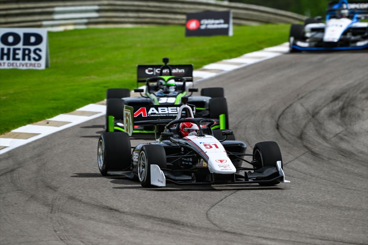 Primo successo in Indy NXT per il pilota di Abel Motorsport dopo aver lottato con Siegel. Roe completa il podio, Foster rimonta dal fondo fino alla quinta posizione.