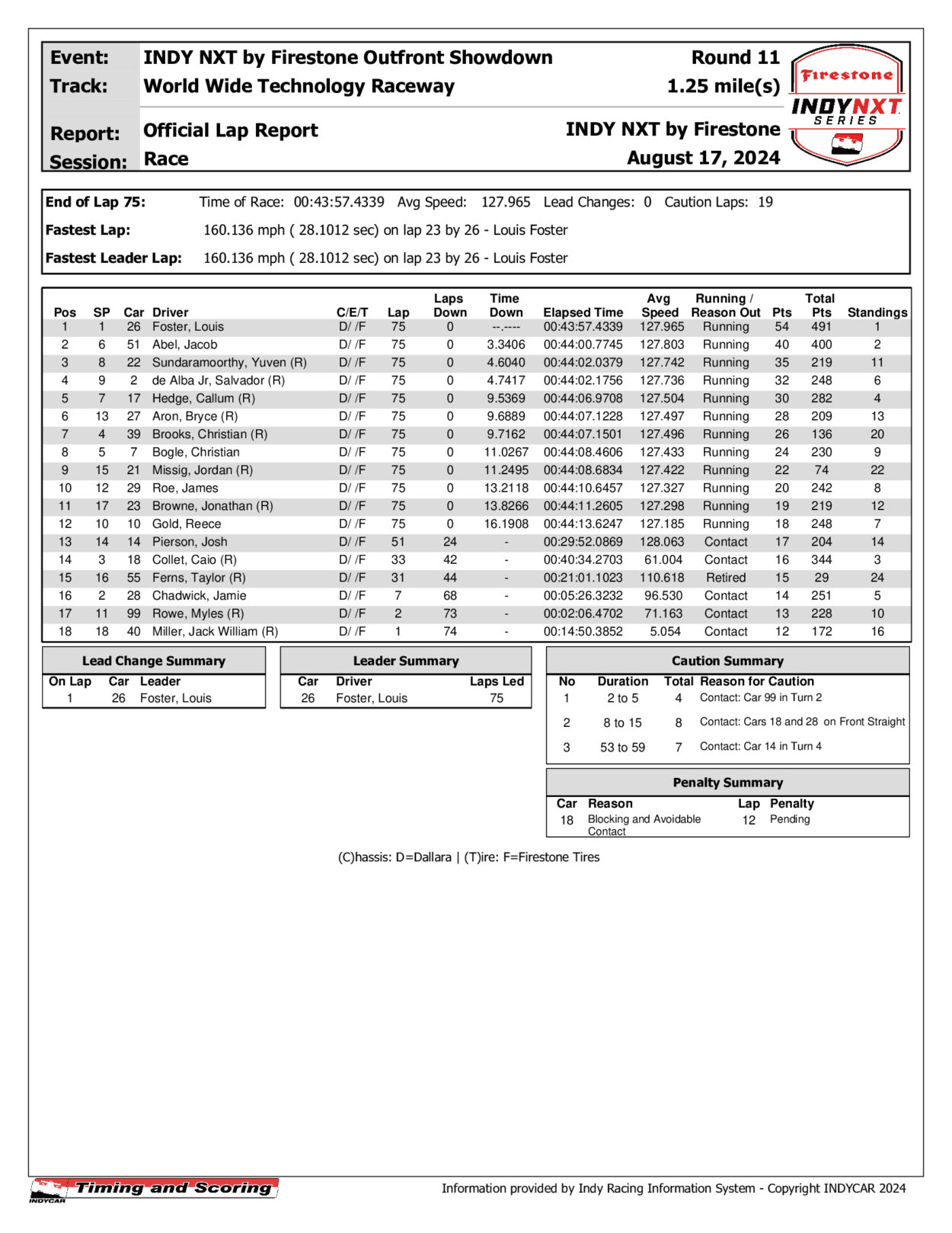 A tre gare dal termine, la classifica del campionato vede Foster sempre più al comando con 491 punti contro i 400 di Abel, secondo a -90 dal pilota inglese di Andretti Global. Sempre più distante Caio Collet, terzo a quota 344. La Indy NXT tornerà in azione la prossima settimana a Portland, per il terz’ultimo round della stagione 2024 nonché l’ultimo appuntamento che si disputerà su un circuito stradale.
