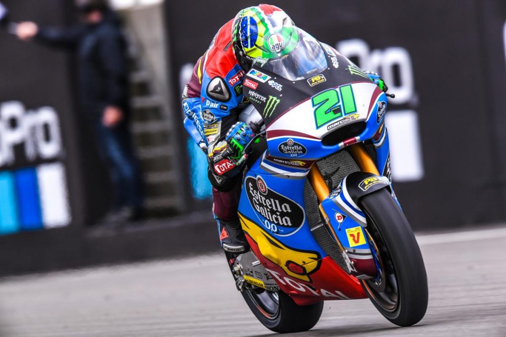 Alla partenza scatta bene il poleman Oliveira su KTM, mentre Pasini viene chiuso dai due piloti del team Marc VDS e si deve accodare in quarta posizione. Subito dietro Corsi e Luthi, il quale nel primo giro è scatenato e si porta al terzo posto superando anche Alex Marquez. Oliveira rimane poco davanti, perché già al curvone Morbidelli passa davanti. Stressando notevolmente la gomma, “Franky” pone circa due secondi tra sé e gli avversari, tra cui Pasini che passa in seconda posizione poco dopo.