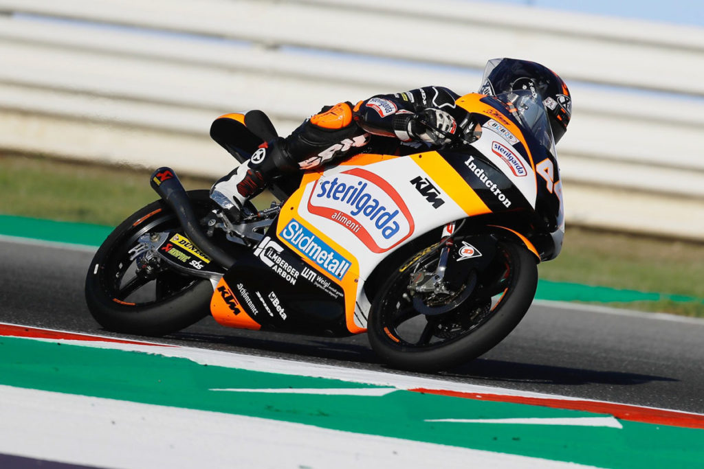 Dalla prima fila partono molto bene Canet e Ogura che mantengono le proprie posizioni in curva 1, mentre Vietti è più attardato e scivola al quinto posto dietro López e Kornfeil. Arbolino ne guadagna una ed è sesto, mentre Dalla Porta perde ben quattro posti rispetto al via e si ritrova a fare spallate col suo compagno Ramírez, mandato largo dall’italiano alla 9.
