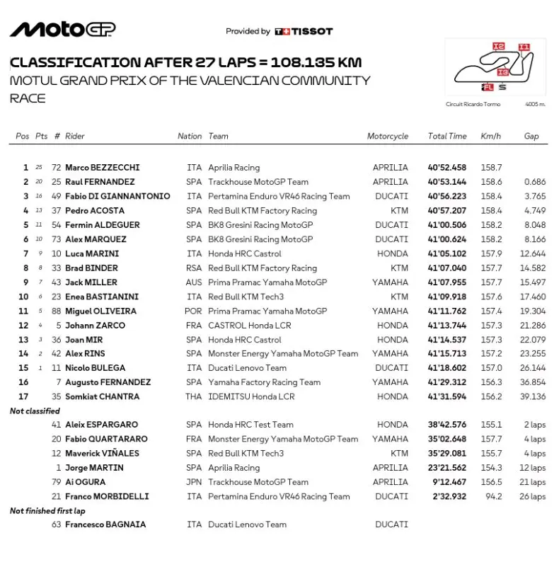 La Ducati ufficiale chiude con il solo Nicolò Bulega in pista, 15° al traguardo. Pecco Bagnaia chiude la stagione con l’ennesima caduta, incolpevole. Bagnaia è vittima del lungo di Johann Zarco che lo manda in ghiaia e poi a terra nel corso del primo giro. Male e sfortunato Franco Morbidelli. Il pilota del team VR46 cade in griglia di partenza, sorpreso dall’ultima frenata di Aleix Espargaró per piazzarsi in piazzola. Il pilota italiano torna in pista in fondo al gruppo ma si ritira poco dopo, con colore alla mano sinistra, per la quale si rileva una frattura al quinto metacarpo dopo un primo controllo al centro medico. Morbidelli salterà i test. Miguel Oliveira lascia la MotoGP con l’11° posto finale.