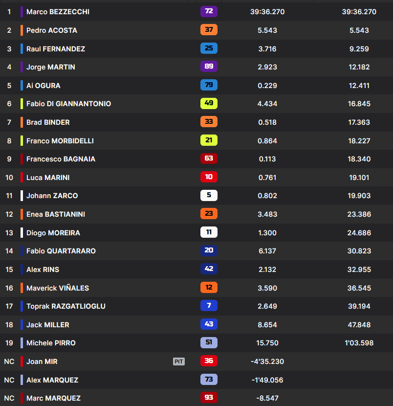 Con Mir e i fratelli Márquez out, Di Giannantonio è sesto nel finale sulla seconda KTM ufficiale di Brad Binder e l’altra VR46 di Franco Morbidelli. L’italiano si libera, nel finale, della Ducati Lenovo di Francesco Bagnaia, in difficoltà per tutta la gara e non nel finale. A chiudere la top ten, Luca Marini con la Honda ufficiale rimasta in pista.