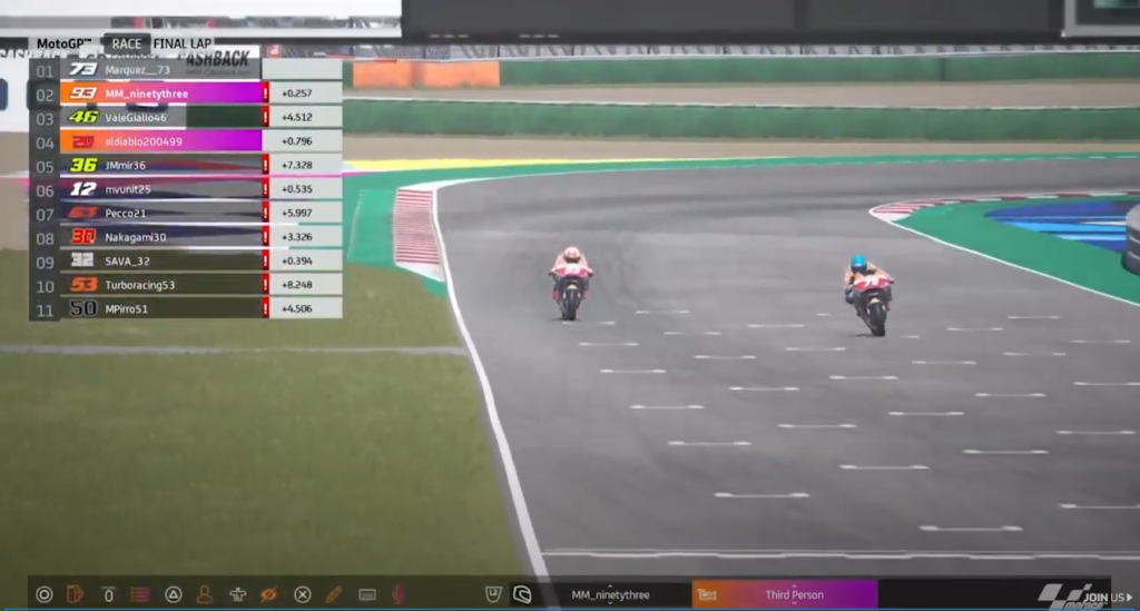 La seconda gara corsa con MotoGP 20 è stata configurata sulla durata di nove giri. La partenza, come spesso accade, mette fuori gioco alcuni piloti alla prima curva tra cui Vinales e Bagnaia, con Quartararo che scappa in testa davanti ai fratelli Marquez e a Lorenzo Savadori, a bordo dell’Aprilia. Anche Rossi cade durante il primo giro.