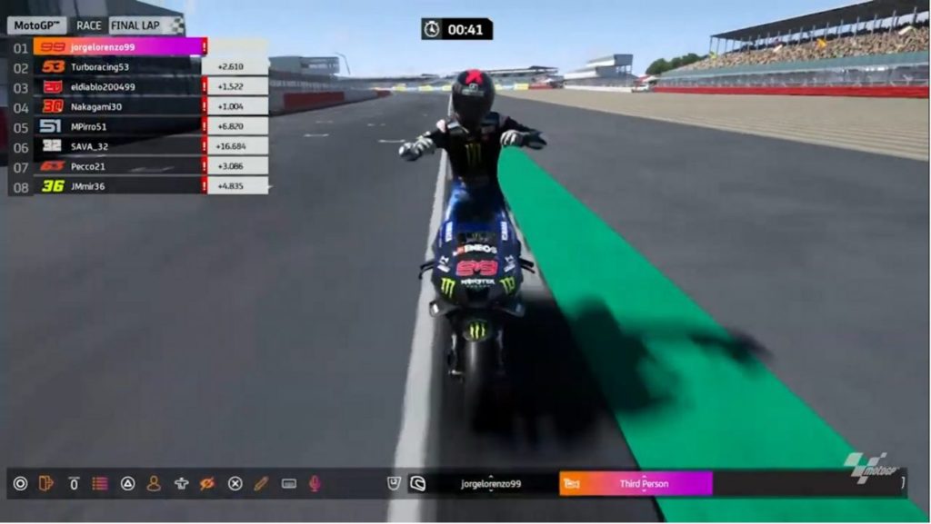 La gara della MotoGP è stata vinta, a sorpresa, da Jorge Lorenzo, wildcard sulla pista emulata di Silverstone. Il maiorchino, dopo aver fatto anche la pole position, è riuscito a rimontare dopo una caduta nelle prime curve causata da Takaaki Nakagami, fino a raggiungere il leader Tito Rabat nei giri finali. Il sorpasso ai danni del connazionale è avvenuto all’uscita di Maggots, a tre giri dalla fine.