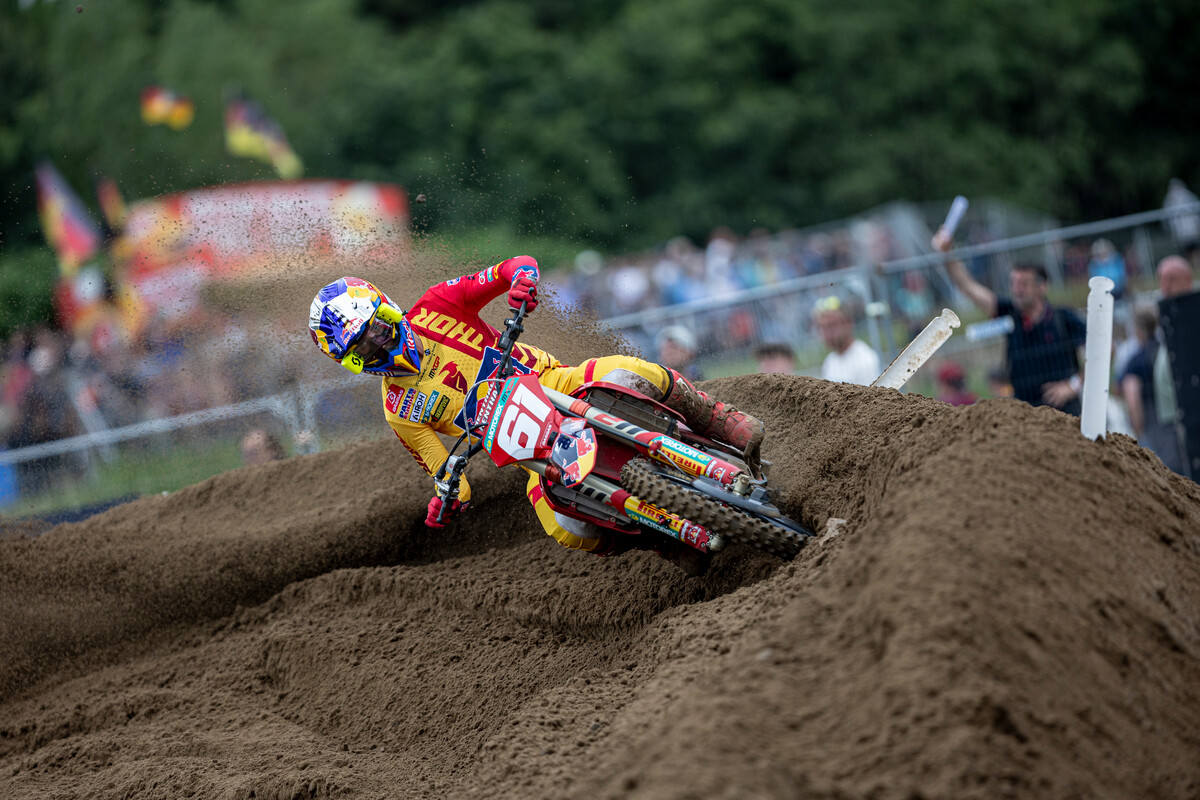 Da vero amante della pioggia e dei circuiti “pesanti”, Simon Längenfelder ha dominato la corsa della MX2 con un copione analogo a quello seguito poi dal compagno di squadra in MXGP. Il tedesco si è lasciato alle spalle Sacha Coenen, alla sua prima top 3 iridata seppur solo in una manche di qualifica, mentre Jago Geerts ha dovuto dare fondo a qualche energia extra per guadagnare un paio di posizioni nel finale.