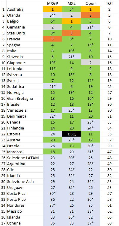 La pole position per il Motocross delle Nazioni numero 78 è appannaggio dell’Australia, forte naturalmente di due vittorie come risultati conteggiati. Segue l’Olanda a cinque punti con Belgio e Germania a quota sei e Stati Uniti a sette. Ottava posizione per una discreta Italia, impressiona la comoda qualificazione del Giappone al decimo posto. L’esperienza sul suolo americano ha giocato a favore del Venezuela, rientrato nei primi 20 per la terza volta su 15 partecipazioni. Dovranno passare per i ripescaggi compagini come Canada, Finlandia, Estonia e Austria.
