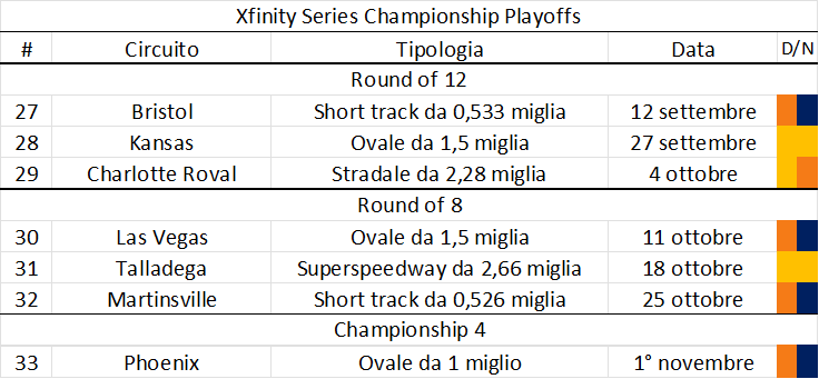 Il Round of 8 rischia di essere infuocato, anche qui con molta varietà: al posto di Bristol c’è Martinsville come taglio prima di Phoenix, al posto del Kansas c’è Las Vegas mentre la variabile impazzita non sarà uno stradale bensì il superspeedway di Talladega in cui i primi cuori potrebbero venire infranti ancora prima di Martinsville. Poi la tappa in Arizona dove si assegnerà il titolo su un ovale piatto da un miglio; in primavera ci vinse Aric Almirola, tuttavia l’ultimo potenziale test è stato quello di Gateway e lì ha vinto (ancora) Zilisch, quindi il potenziale pronostico con Allgaier trionfatore potrebbe essere ribaltato.