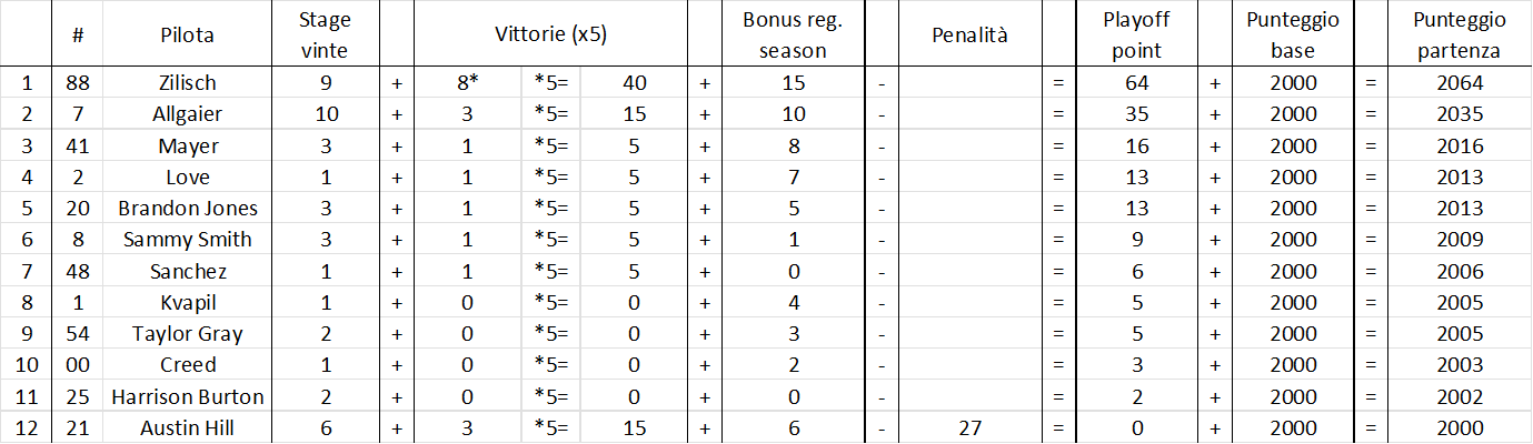 Già, sui playoff point c’è molto da discutere perché la tabella ha parecchi asterischi. Primo fra tutti, quello riguardante Connor Zilisch che secondo gli almanacchi ha nove vittorie, ma per questo conteggio solo otto in quanto a Daytona, in seguito alla clavicola fratturata in victory lane al Watkins Glen, ha iniziato la corsa poi scendendo dalla vettura cedendo il volante a Parker Kligerman. Il regolamento, ancora molto old style su questo tema, è chiaro: chi inizia la gara si porta a casa ogni risultato conseguente dalla bandiera a scacchi, ma (appendice recente) nessun benefit in materia di playoff point o playoff in generale. Dunque, col capolavoro di Kligerman all’overtime, Zilisch ha portato sì a casa i 40 punti e la vittoria da almanacco, ma non i cinque playoff point conseguenti.