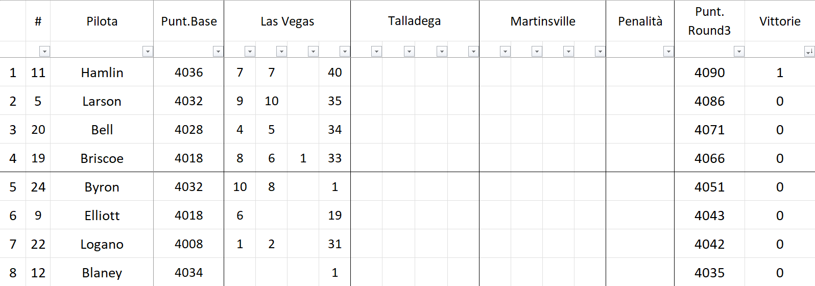 Prima di Talladega e Martinsville, la classifica generale vede ora Larson a +35 sul taglio, poi Bell (+20) e Briscoe (+15) mentre sotto alla linea rossa ci sono i tre grandi sconfitti di Las Vegas, ovvero Byron (-15), Elliott (-23) e Blaney (-31) mentre Logano, in assenza di vittoria, partiva a -24 ed è rimasto a -24.