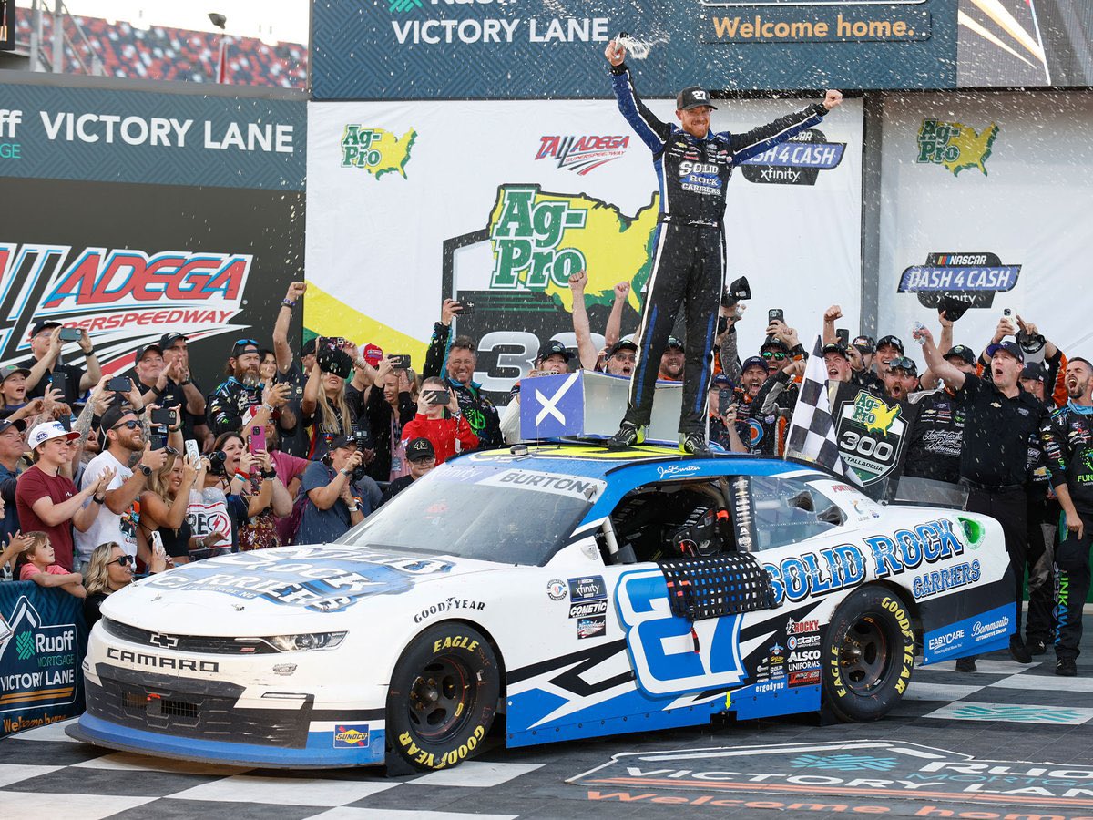 Jeb Burton vince la Ag-Pro 300 a Talladega. Il pilota della Chevrolet #27 torna in victory lane due anni dopo il primo successo in carriera, avvenuto proprio in questa pista.