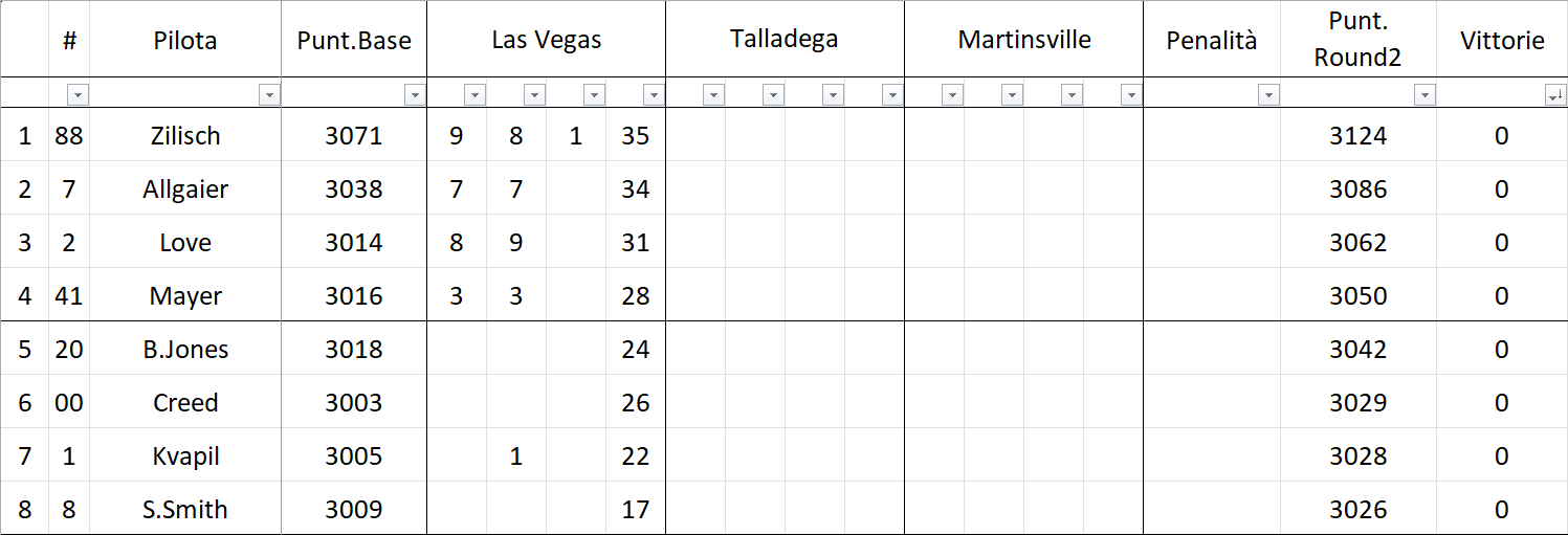 Aric Almirola vince a Las Vegas e porta la #19 a Phoenix al punto che, nella conferenza stampa post gara, arriva la conferma non ufficiale che al gran finale in vettura ci sarà lui e non Justin Bonsignore come previsto. Zilisch è secondo e deluso (+0.7″), ma per lui è comunque la 18esima top5 consecutiva che vale anche il +78 sul taglio. A seguire Allgaier (+1.4″), Day (+3.5″), Sanchez (+4.0″), Love (+5.0″), R.Sieg (+5.8″), Gray (+6.5″), Mayer (+7.0″) ed Hill (+7.8″); Creed 11° davanti a Sawalich, Jones, H.Burton, Kvapil, Hemric, Dye, Eckes, DiBenedetto e Smith. Ed ora sotto con Talladega per il vero ribaltone in classifica generale.
