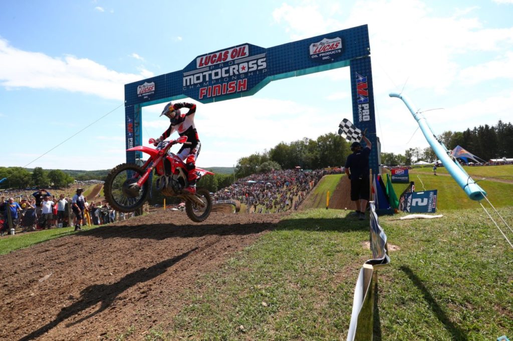 Nella classe 250 tutto ancora apertissimo per il titolo grazie alla vittoria di Jett Lawrence (2-1) a quattro punti in classifica da Justin Cooper (1-4) secondo e davanti al suo compagno di squadra, fresco di rinnovo Jeremy Martin (2-3). Da capire se Honda, che da qualche giorno ha presentato la sua nuovissima 250, deciderà di schierarla per le ultime gare del campionato affidandola ai fratelli Lawrence. Il National torna in pista sabato prossimo per l’appuntamento del Budds Creek.