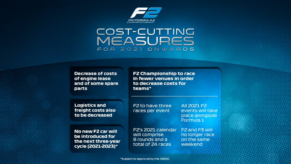 Il periodo difficile dovuto alla pandemia di Covid-19 ha convinto la FIA e il promoter ad introdurre un programma di riduzione dei costi che riguarderà il leasing dei motori, i pezzi di ricambio, la logistica e gli spostamenti, oltre al numero di round che calerà a otto per la F2 e a sette per la F3. Il ciclo della Dallara F2 2018 verrà inoltre esteso al 2023, mentre quello della F3 2019 si potrebbe concludere alla fine del 2021 ma anche in questo caso c’è la possibilità di vedere una proroga.