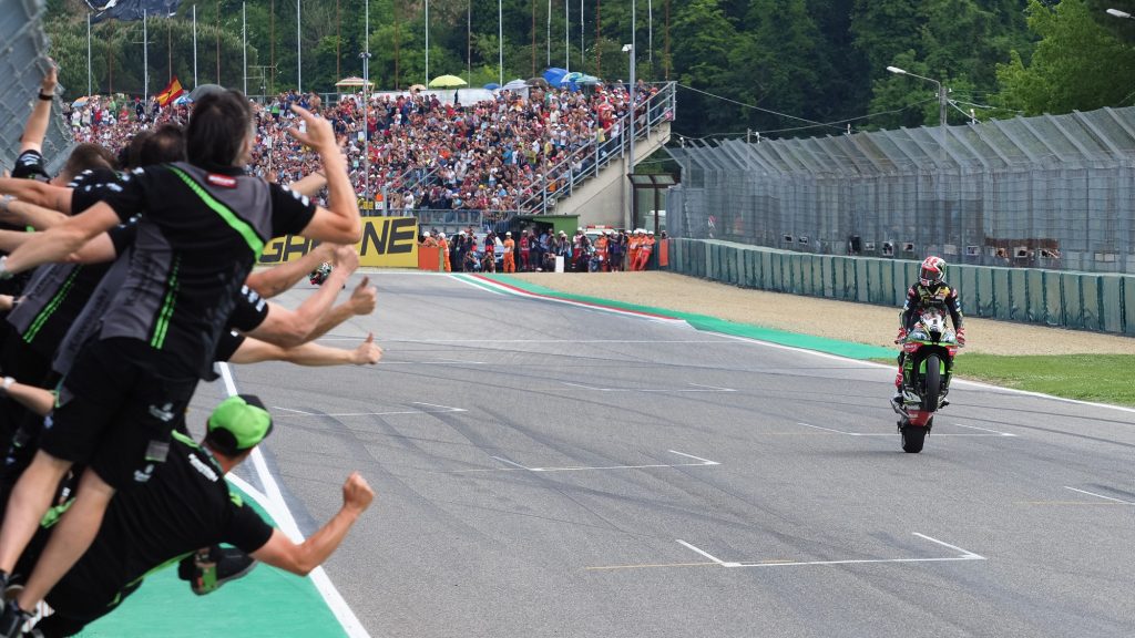 Dopo un duello durato dieci giri cattivi con il suo rivale Chaz Davies, Jonathan Rea ha ottenuto il secondo successo del weekend, riottenendo una doppietta che, a conti fatti, mancava dal Gran Premio del Qatar dell’anno scorso. Un successo però tutt’altro che semplice, poiché come detto a complicargli la vita ci ha pensato il gallese della Ducati: partito dalla pole position, il #7 è passato al comando dopo aver superato il giovane Rinaldi ma si è trovato subito alle spalle il falco della Kawasaki; da quel momento in poi il campione del mondo e il vicecampione hanno dato vita a un duello durato fino a sette tornate dal termine, conclusosi a favore del pilota Kawasaki dopo un sorpasso alla Variante Alta. Nonostante il cambio regolamentare, la ZX-10RR pare ancora stellare in tutto e per tutto.