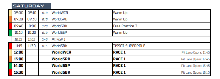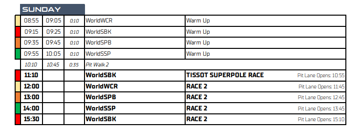 Il cambiamento più importante riguarda lo spostamento della SBK ad ultimo evento di giornata, per quanto concerne sabato e domenica. Fino al 2025 la SBK ha sempre occupato la fascia oraria classica delle 14:00 (eccezion fatta di quando c’erano concomitanze con altre competizioni, su tutte MotoGP e F1), ma dal 2026 le due manche principali, Gara 1 e Gara 2, si svolgeranno alle 15:30.