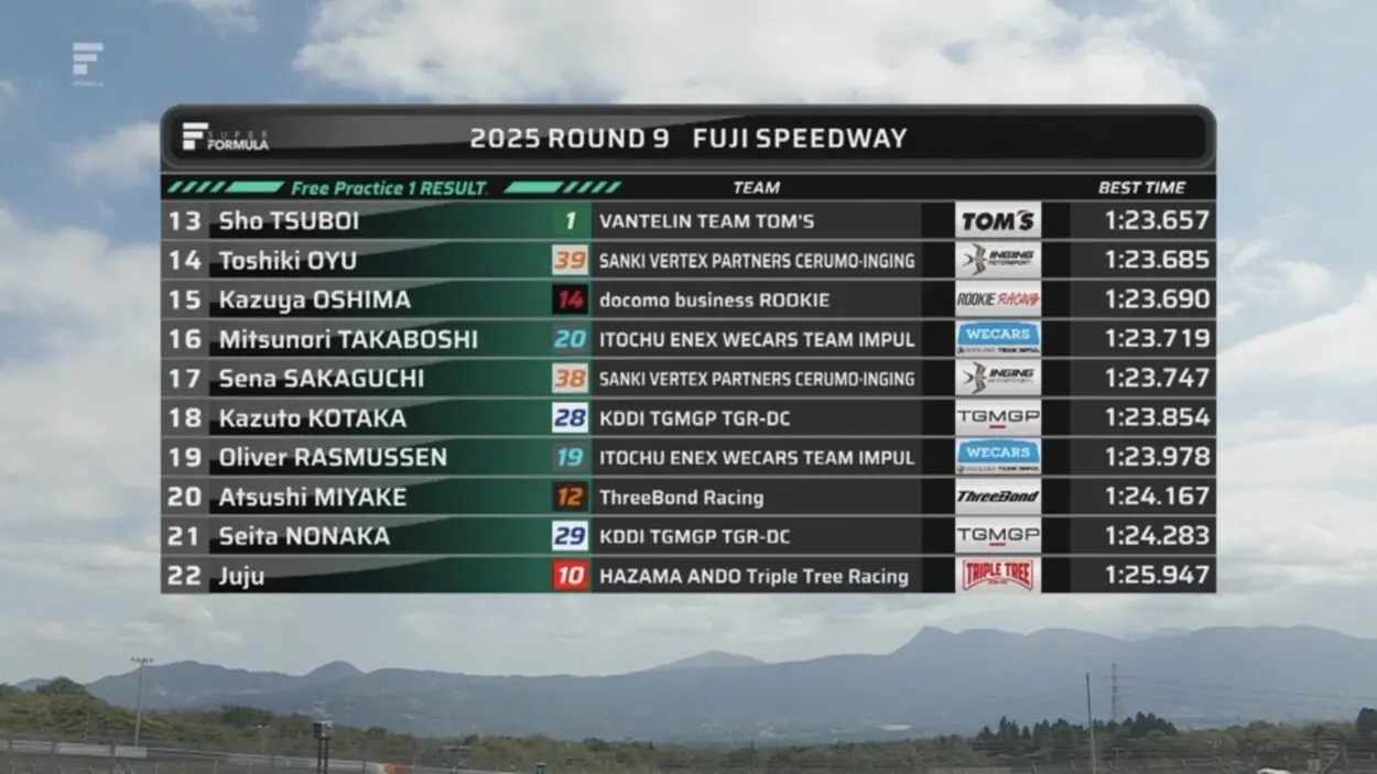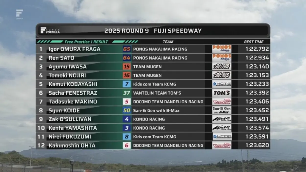 Sesta posizione per Sacha Fenestraz (+0.600): il pilota franco-argentino dovrà dare continuità al Fuji Speedway dopo il podio ottenuto a Sugo. Settimo Tadasuke Makino (+0.614), seguito da Syun Koide (+0.660) e Zak O’Sullivan (+0.699), mentre chiude la Top 10 Kenta Yamashita con il decimo tempo a 782 millesimi dalla vetta. Nirei Fukuzumi è undicesimo a 799 millesimi da Fraga, mentre in dodicesima e tredicesima piazza troviamo gli altri due contendenti per il titolo Kakunoshin Ohta (+0.828) e Sho Tsuboi (+0.865).