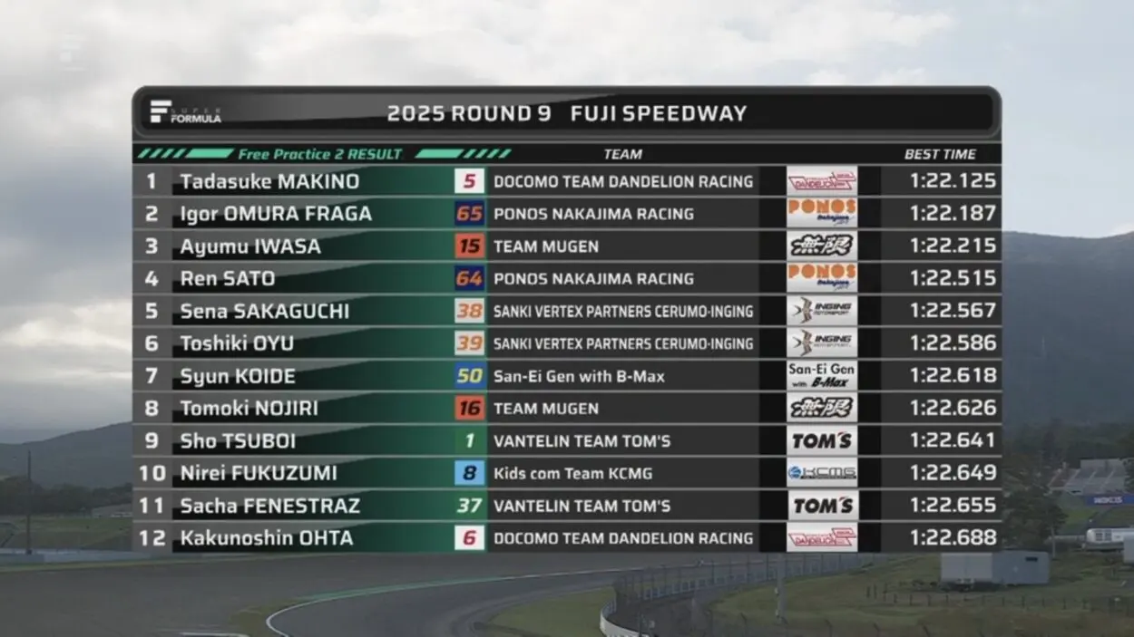 Super Formula – Fuji #2 2025: Classifica Free Practice 2