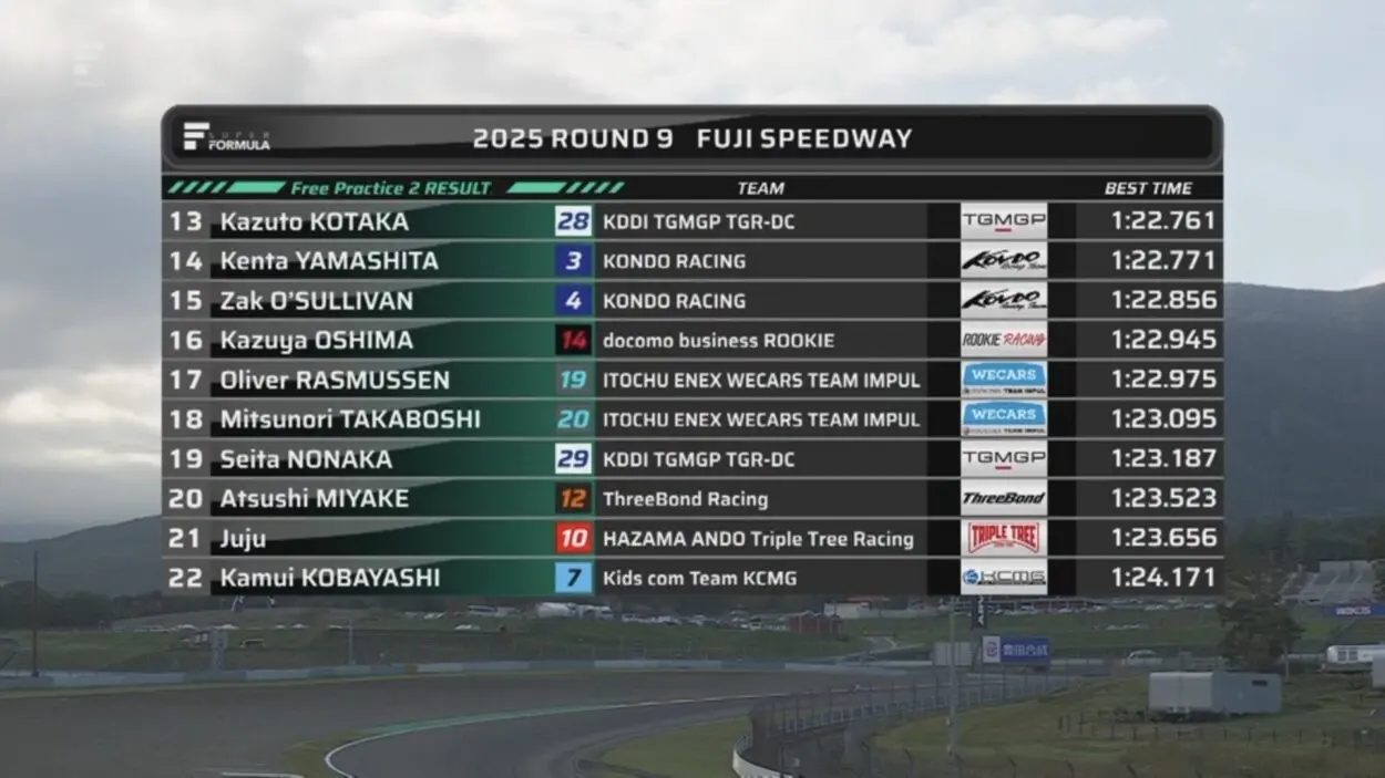 Tredicesima piazza per Kazuto Kotaka (+0.636), davanti ai due piloti di Kondo Racing Kenta Yamashita (+0.646) e Zak O’Sullivan (+0.731). Sedicesimo Kazuya Oshima (+0.820), in quello che per lui sarà l’ultimo weekend di gara con le Super Formula al Fuji Speedway, mentre in diciassettesima e diciottesima posizione troviamo i due alfieri del Team Impul Oliver Rasmussen (+0.850) e Mitsunori Takaboshi (+0.970). Chiudono la Top 20 Seita Nonaka (+1.062) e Atsushi Miyake (+1.398), seguiti da Juju Noda (+1.531) e Kamui Kobayashi (+2.046), quest’ultimo fermato da un problema meccanico che l’ha costretto allo stop in curva 8, causando così l’unica bandiera rossa della sessione.