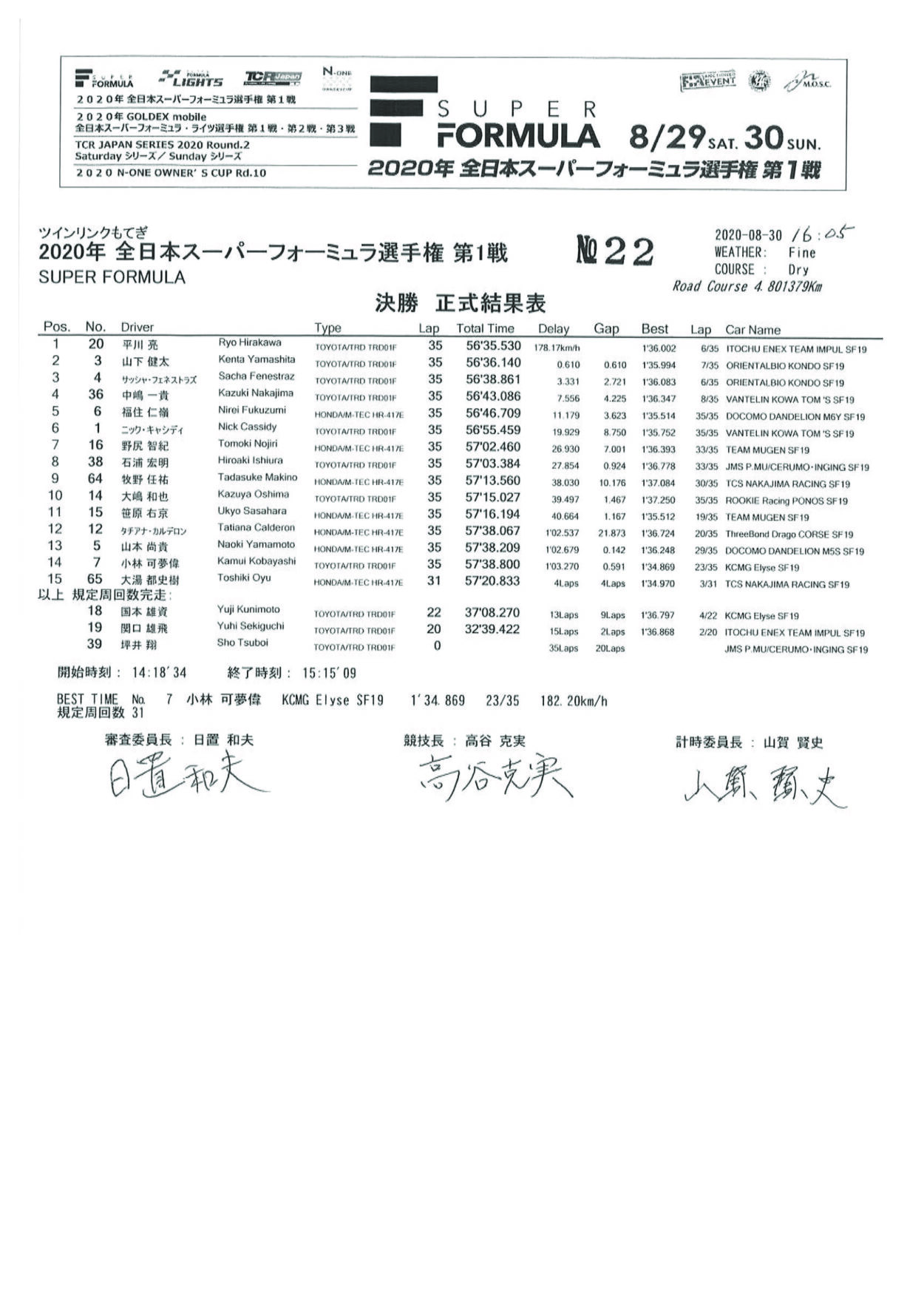 Il finale di gara vede Yamashita recuperare terreno su Hirakawa tanto da tallonarlo incessantemente negli ultimi giri, ma l’attuale pilota Toyota nel WEC non sbaglia nulla fino alla bandiera a scacchi e si aggiudica la vittoria del primo round del campionato 2020, la seconda della propria carriera in Super Formula dopo quella ottenuta poco più di un anno prima sempre a Motegi. In più, Hirakawa è diventato il primo vincitore con l’attuale sistema di punteggio presente in Super Formula, introdotto proprio nel 2020 e valevole per tutte le gare del campionato che assegna 20 punti al vincitore, 15 al secondo classificato, 11 al terzo e così via fino al 10° classificato che riceve un punto, oltre ai punti riservati ai primi tre piloti classificati nelle qualifiche, con tre punti all’autore della pole position, due al secondo classificato ed uno al terzo.