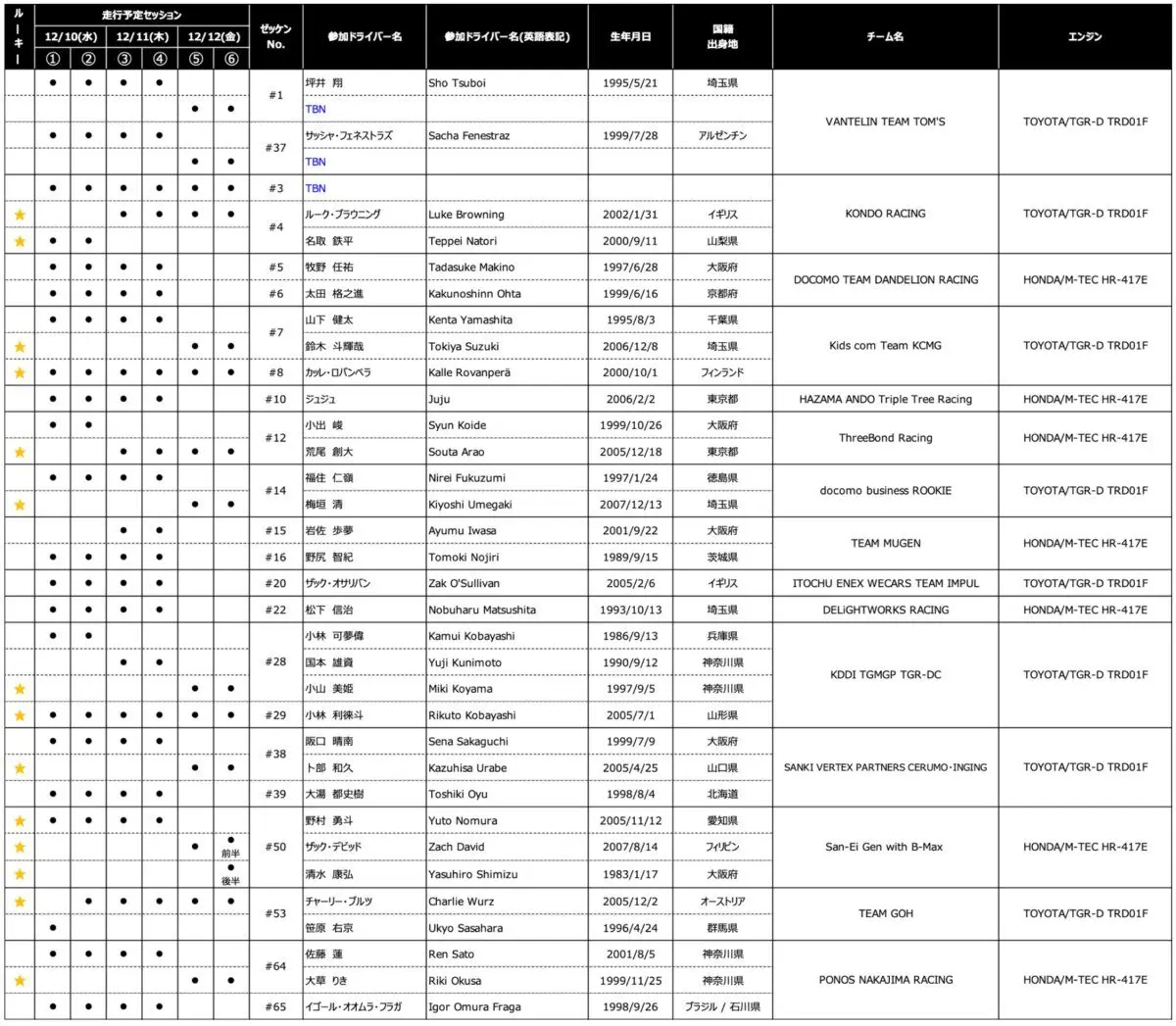 Altre novità arrivano dal Team Impul, il quale schiererà una sola vettura per il test, con al volante Zak O’Sullivan. Kazuhisa Urabe, invece, ritornerà con Inging Cerumo per il rookie test, affiancando i confermati Sena Sakaguchi e Toshiki Oyu, mentre Riki Okusa farà solo la terza giornata con Nakajima Racing, mentre i primi due giorni saliranno in macchina i titolari Ren Sato e Igor Omura Fraga. Esordio invece per Delightworks Racing con Nobuharu Matsushita, il quale correrà con il #22, mentre non cambiano nulla il Team Dandelion Racing, con Tadasuke Makino e Kakunoshin Ohta, e il Team Mugen, con Ayumu Iwasa e Tomoki Nojiri. Infine, Juju Noda ritornerà sulla #10 di Triple Tree Racing.