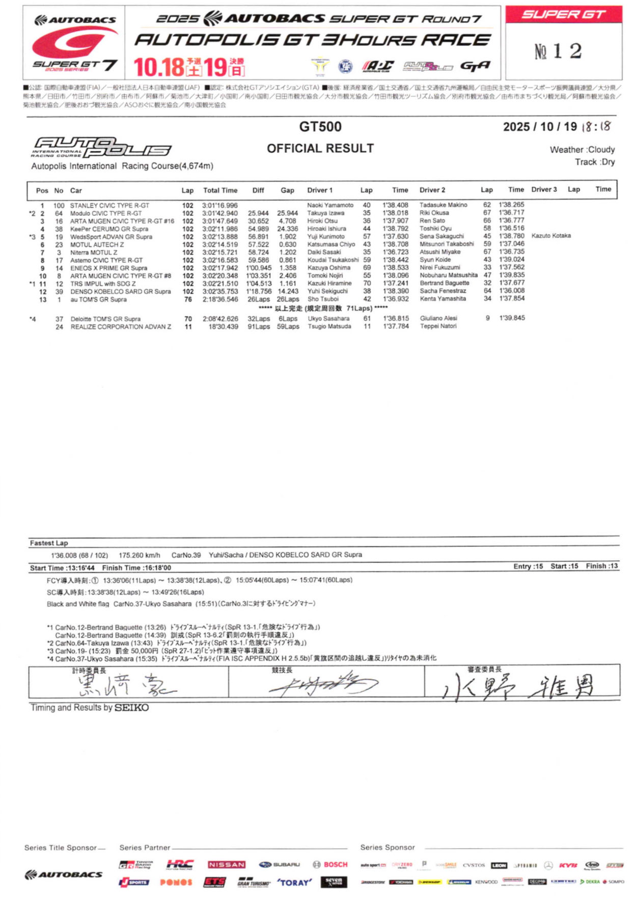 Giù dal podio per la prima volta quest’anno la Toyota, che ha nella #39 di KeePer Cerumo la miglior classificata in quarta posizione, molto abili a recuperare la china dopo un contatto alla partenza che ha visto Toshiki Oyu finire in testacoda. Peggio è andata al duo campione in carica Sho Tsuboi/Kenta Yamashita, costretti al ritiro nell’ultima ora di gara per un problema tecnico. Gara difficile anche per gli equipaggi Nissan, con la #23 di Mitsunori Takaboshi/Katsumasa Chiyo solamente sesti davanti alla Niterra #3 di Daiki Sasaki/Atsushi Miyake partita dalla pole position, protagoniste di una gara “a gambero” perdendo terreno di continuo.