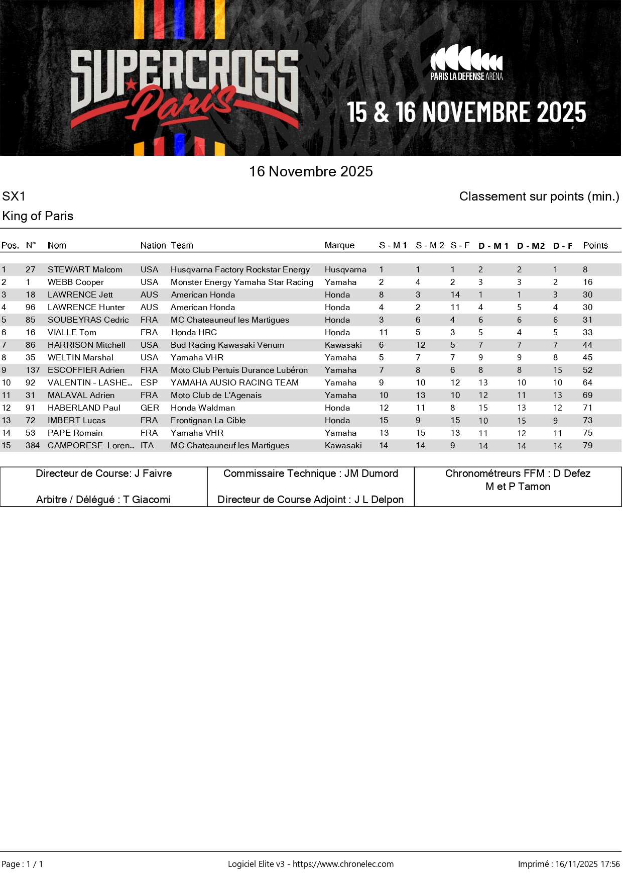 da Parigi – Nella fredda domenica pomeriggio della capitale francese, Malcolm Stewart ha completato il suo weekend perfetto aggiudicandosi la 42esima edizione del Supercross di Parigi nella classe SX1 e segnando un importante passo verso la stagione AMA 2026. In SX2 Anthony Bourdon ha ulteriormente contribuito ad infiammare il pubblico francese sconfiggendo in rimonta Luke Clout.