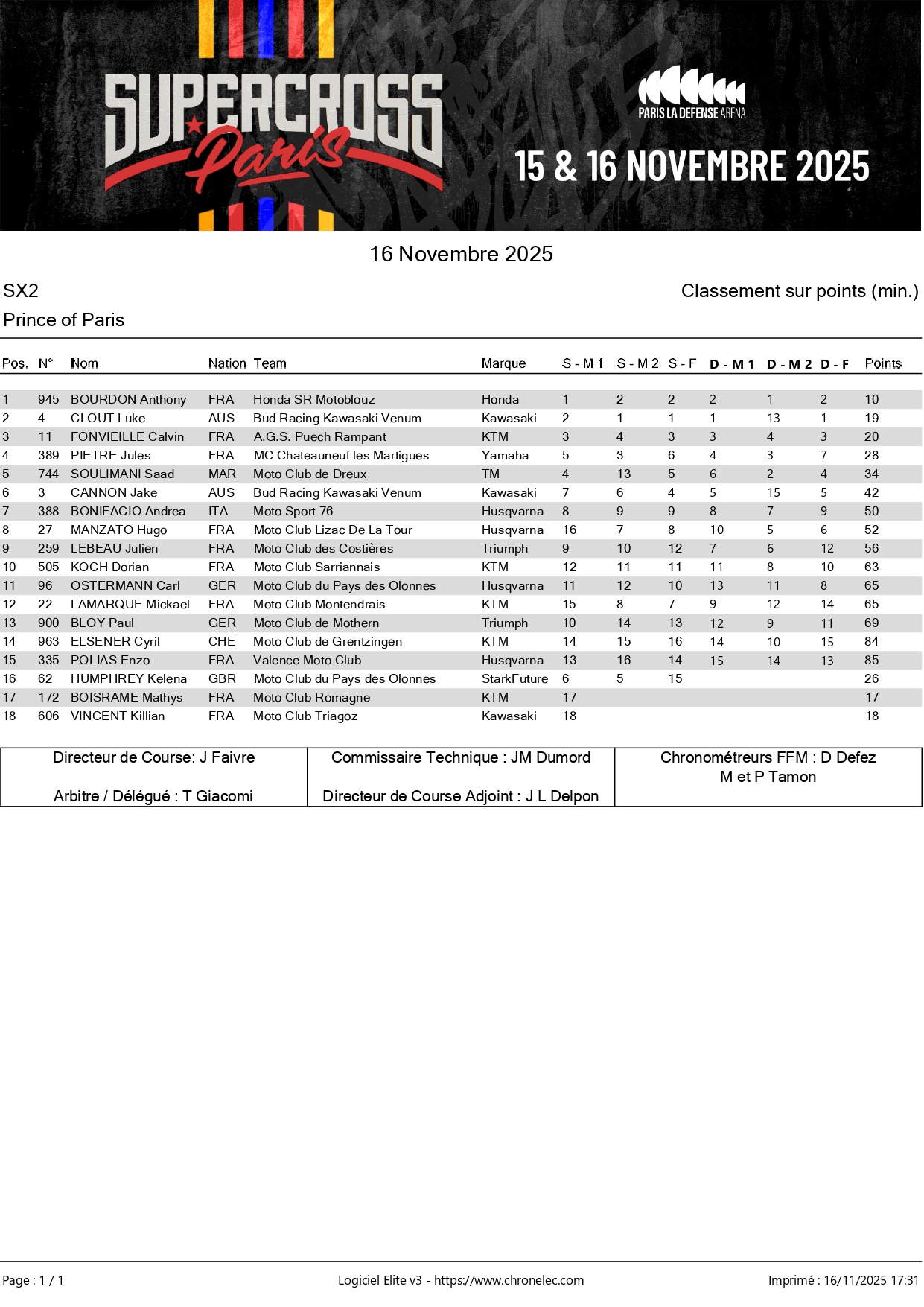 Nella premiazione finale ha trovato posto anche il leader del campionato transalpino Fonvieille, terzo in apertura e chiusura e quarto nella manche di mezzo. Il pilota KTM ha accarezzato anche il secondo posto overall ma Clout si è rivelato troppo più forte nell’ultima sfida. Vantaggio di assoluta sicurezza nei confronti di Jules Pietre (4-3-7), quarto a -8 dal podio.