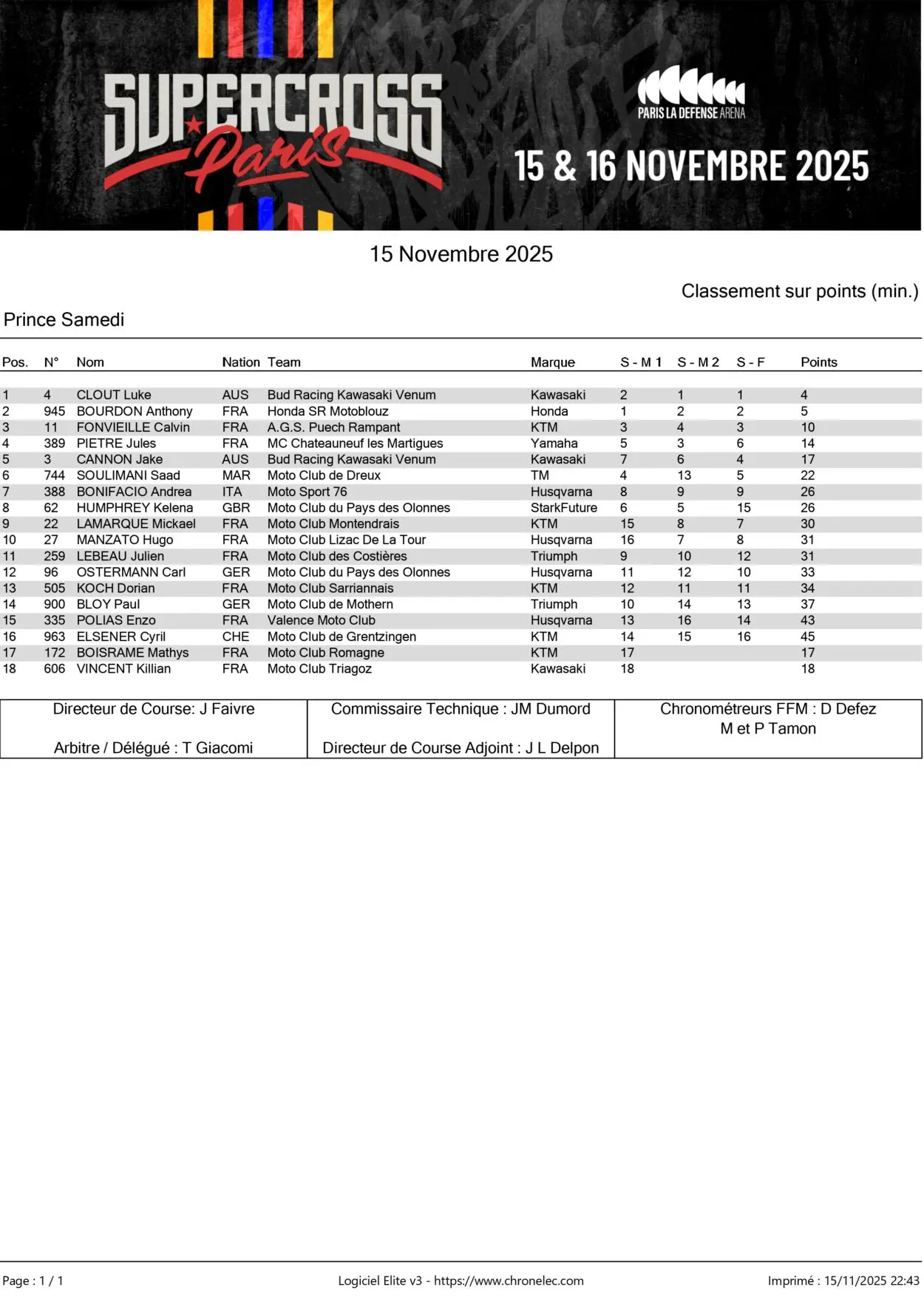 Nella classe SX2 si parlava di un pronostico piuttosto aperto alla vigilia ma dal sabato sono comunque emersi i due nomi più in voga, quelli di Luke Clout e Anthony Bourdon. L’australiano del team Bud Racing e l’acclamatissimo idolo di casa, su una Honda preparata da Motoblouz, si sono prodotti in due manche sprint “a specchio”, con il leader iniziale (Clout in gara-1, Bourdon in gara-2) raggiunto e superato nelle fasi conclusive, mentre la decisiva gara-3 ha visto Clout imporsi approfittando della cattiva partenza di Bourdon. La lotta per il Prince of Paris ricomincerà dunque con il campione Down Under in vantaggio di un punticino.