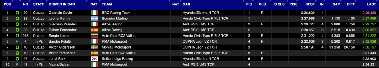 Alla ripresa, a imporsi davanti a tutti, è stata ancora una volta la Hyundai #30 con Gabriele Covini al volante, il quale ha abbassato il tempo di tre secondi portandolo a 2:26.839. L’argentino scalzato dalal P1 si è comunque migliorato, rimanendo secondo ma pagando oltre un secondo di ritardo. Tutti gli altri piloti hanno invece preferito affrontare un secondo giro di lancio, prima di affondare il piede sull’acceleratore.
