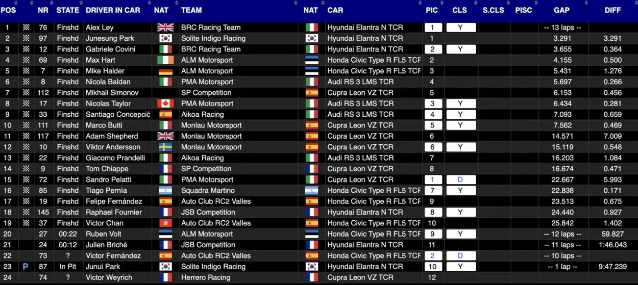 Il quarto posto va a Max Hart che ha preceduto Mike Halder come prima delle Honda, mentre al debutto in PMA Motorsport Nicola Baldan chiude nella stessa posizione di partenza. Settima piazza per la prima delle Cupra con Mikhail Simonov, quindi Nicolas Taylor, Santiago Concepción in rimonta dall’ottava fila e quindi Marco Butti a chiudere la Top10, dopo aver dovuto rimontare dal contatto contro le barriere.