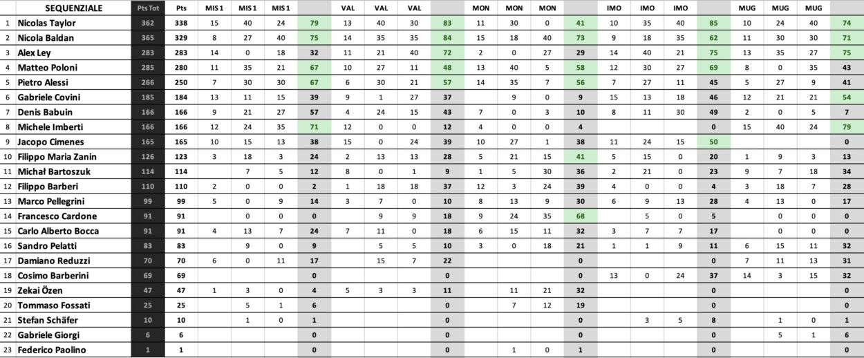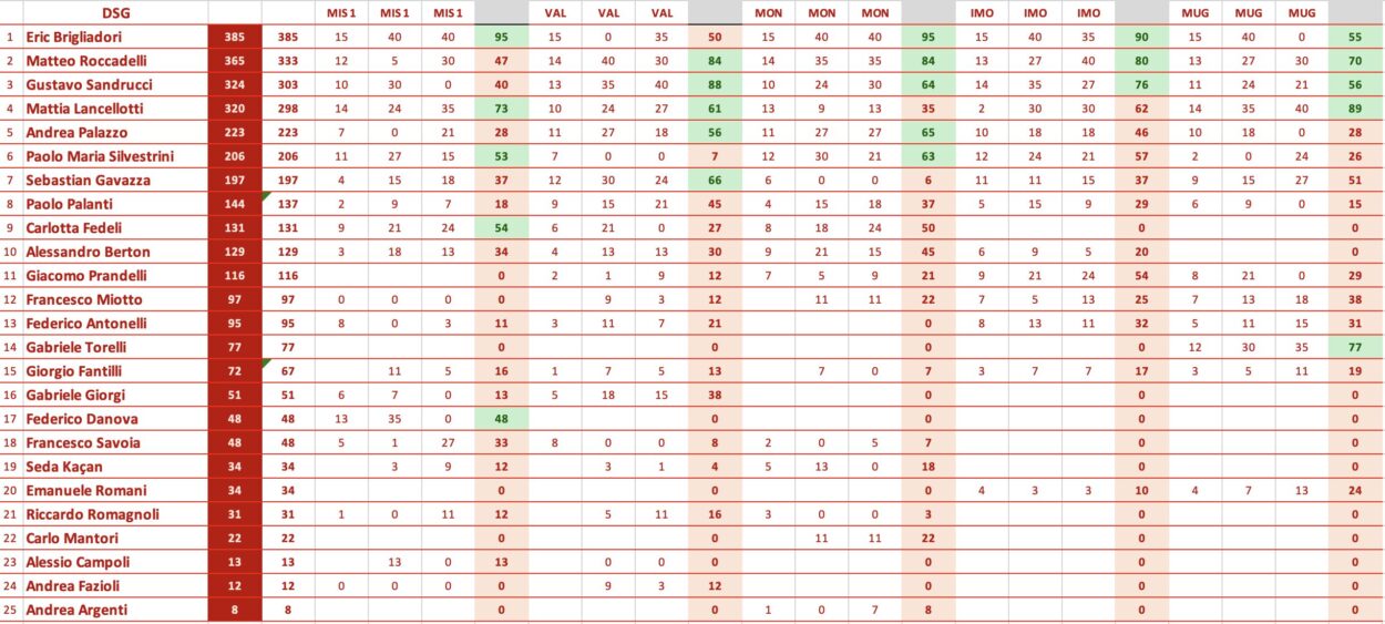Attualmente la classifica lo vede in vetta con 385 punti, ma solo 20 lunghezze di vantaggio sul compagno di squadra Matteo Roccadelli. Se però il cesenate non ha punteggi da dover cancellare, in questo momento il vercellese dovrebbe cancellare 32 punti dalla sua classifica, arretrando dunque a 52 punti di gap.