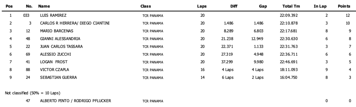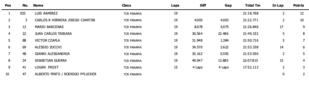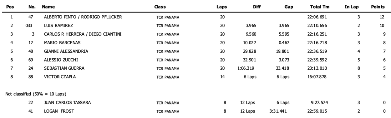 Rodrigo Pflucker quindi vince la prima gara del TCR Panama 2026 davanti a Luis Ramírez a cui ha inferto un distacco di quattro secondi in un terzo di corsa. Podio all’esordio assoluto nel TCR per Diego Ciantini, che in conclusione ha resistito a Mario Bárcenas, giunto a meno di mezzo secondo dalla Top3.