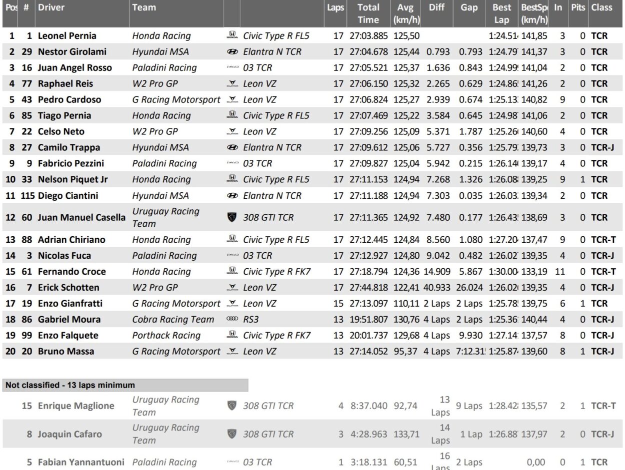 Leonel Pernía vince dunque la prima gara del 2026 precedendo Néstor Girolami e Juan Ángel Rosso sul podio del TCR South America e Raphael Reis e Pedro Cardoso (4° e 5° assoluti) su quello del TCR Brasil. Tiago Perniá, dopo un ottimo spunto al via, chiude solo sesto davanti a Celso Neto e Camilo Trappa, vincitore della Copa Junior, quindi Fabricio Pezzini e Nelson Piquet Jr a completare le prime dieci posizioni.