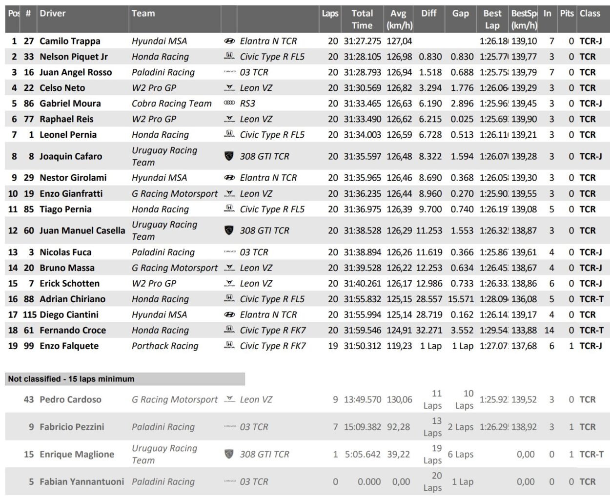 Il brasiliano di Honda conquista invece il successo nel TCR Brasil, mettendo alle proprie spalle Celso Neto, alla prima Top3 in carriera con la Cupra, e Gabriel Moura invece al primo podio nel TCR, anche lui come Trappa nel fine settimana del debutto nella serie.