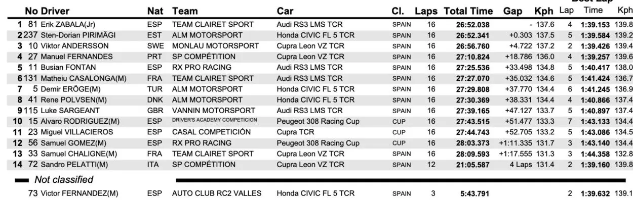 Penalizzato, la lotta per la P1 si è spostata su chi era in quel momento terzo e quarto, ovvero Erik Zabala e Sten-Dorian Piirimägi. Questa volta lo spagnolo ha saputo resistere sull’estone per prendersi la rivincita e conquistare la prima vittoria in carriera per sé e la prima per il Team Clairet Sport nel campionato spagnolo.