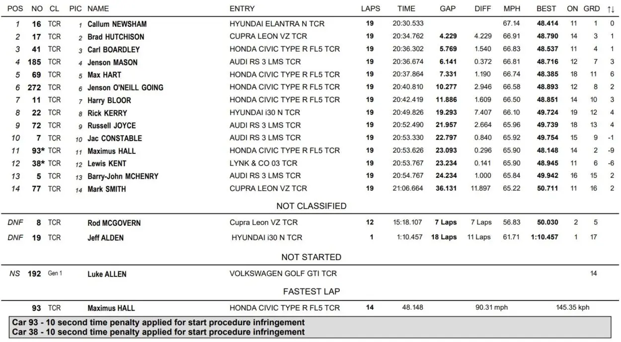 Callum Newsham chiude dunque il primo weekend dell’anno, così come lo aveva iniziato ieri mattina, cioè con la prima posizione. Un successo senza pensieri dato che, dopo la ripartenza e fino al traguardo, ha inflitto oltre quattro secondi al primo degli inseguitori: Brad Hutchison. Ritorna sul podio anche il bicampione del TCR UK Carl Boardley, grazie al sorpasso al penultimo giro e alla difesa delle curve successive.