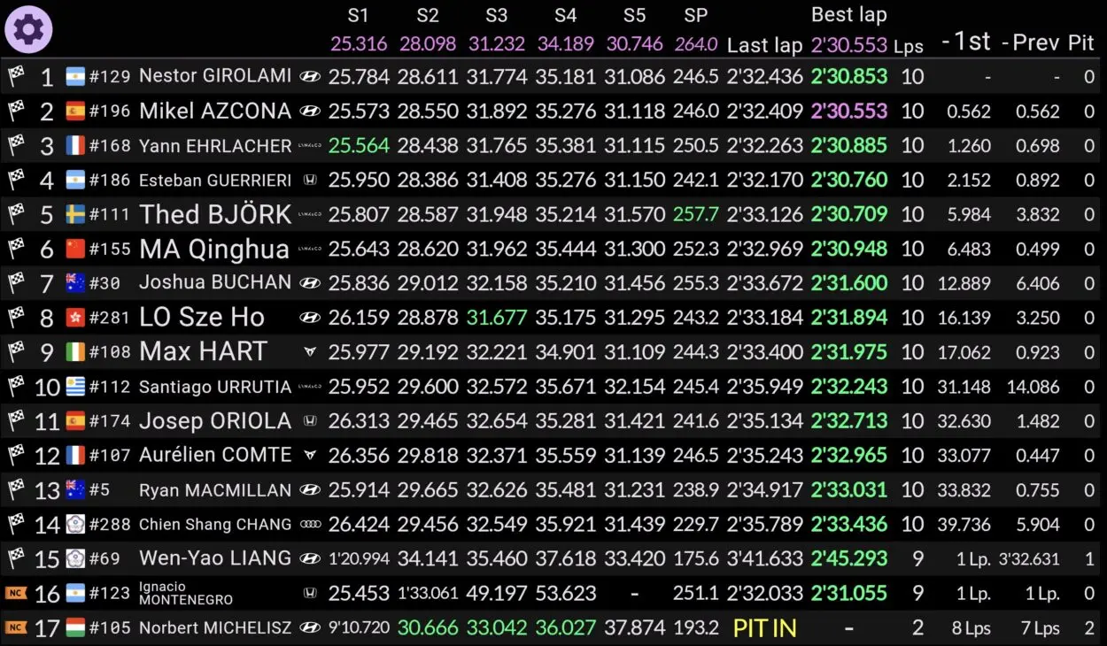 Quarta posizione quindi per Esteban Guerrieri, seguito da Thed Björk e da Ma Qing Hua, quindi a ereditare la settima piazza è stato Josh Buchan, che domani scatterà in pole, dunque Lo Sze Ho a sua volta capace di resistere agli attacchi di Max Hart, giunto nono. Santiago Urrutia ha completato la sua rimonta in decima piazza, lasciandosi alle spalle Pepe Oriola e Aurélien Comte.
