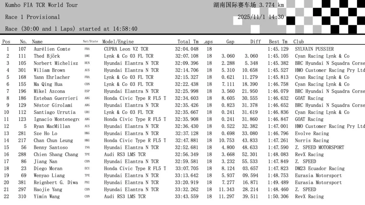 Sesta posizione per Ma Qing Hua, che aveva ripassato Mikel Azcona al penultimo giro, quindi proprio lo spagnolo, seguito da un folto gruppo di sudamericani. Ottava piazza per la prima delle Honda con Esteban Guerrieri, quindi Néstor Girolami e Santiago Urrutia. Domani mattina questi ultimi due scatteranno dalla prima fila di Gara 2 per merito della griglia invertita, con la Lynk & Co a precedere la Hyundai.