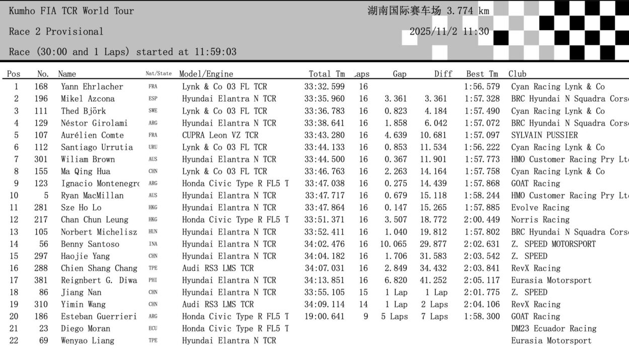 Nel TCR Asia si è invece disputata l’ultima gara valida per l’assegnazione del titolo, con Benny Santoso nuovamente vincente davanti a Yang Haojie e a Sean Chang Chien Shang, il quale – grazie anche al ritiro prima del via di Diego Morán – ha potuto correre con serenità verso la conquista del titolo di campione nella serie asiatica.