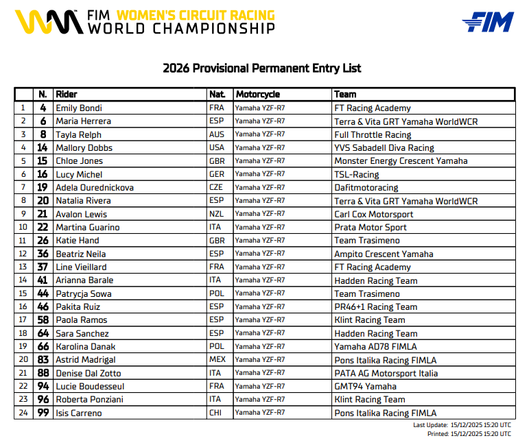 Saranno ventiquattro le partecipanti a tempo pieno del monomarca Yamaha. Rispetto al 2025, la campionessa in carica stavolta difenderà il titolo iridato conquistato nella stagione precedente: María Herrera, passata al team GRT, userà ancora il proprio #6, ma si presenterà come la pilota da battere ai nastri di partenza della WCR 2026.