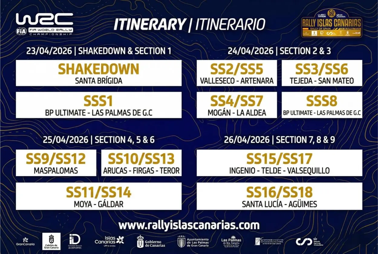 Le sezioni di venerdì saranno poi completate dalla Moya – La Aldea, inserita subito dopo la prova cittadina del giovedì e destinata a diventare una delle chiavi tecniche del nuovo impianto. Il comitato organizzatore, in accordo con la FIA e con il WRC Promoter, ha inoltre rielaborato l’itinerario del venerdì sera per adattarlo alle nuove esigenze, individuando alternative ritenute più efficaci sia per i trasferimenti sia per l’accessibilità alle aree di partenza delle prove e al Parco Assistenza presso lo Stadio di Gran Canaria.