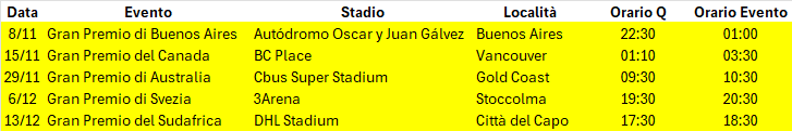 Come detto, il campionato 2025 consterà di cinque Gran Premi e tutti in continenti differenti, nello spazio di sei fine settimana. Si comincia con il debutto in Argentina, per quello che verosimilmente sarà l’ultimo evento all’interno del tracciato di Buenos Aires prima della grande rivoluzione, seguiranno i ritorni in Canada e Australia (quest’ultima in una nuova location), dunque la Svezia rientrata in extremis al posto della Malesia e il gran finale in Sudafrica. Ecco nel dettaglio il calendario e gli orari di gara: