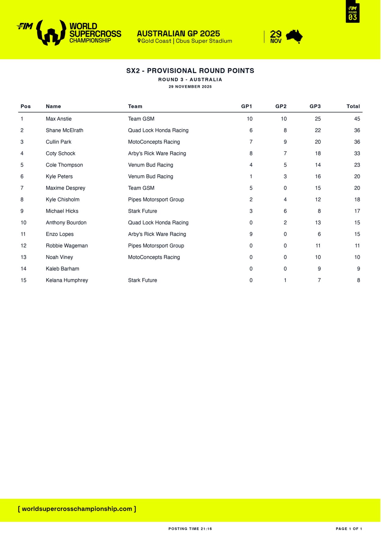 Ci si aspettava qualcosa in più da Cole Thompson, vincitore dell’AUS-X Open di categoria una settimana fa ma solo quinto (7-6-7) in Gold Coast e lontano dalle sue migliori performance. Alle sue spalle l’altra Kawasaki Bud Racing di Kyle Peters (10-8-5) e la Yamaha GSM di Maxime Desprey (6-11-6).